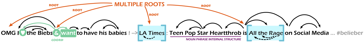 A Dependency Parser for Tweets Lingpeng Kong, Nathan Schneider, Swabha Swayamdipta, Archna Bhatia, Chris Dyer, and Noah A. Smith. In Proceedings of EMNLP 2014.