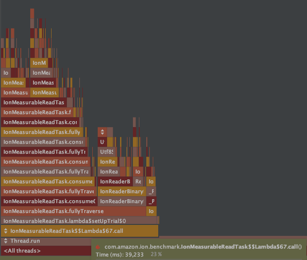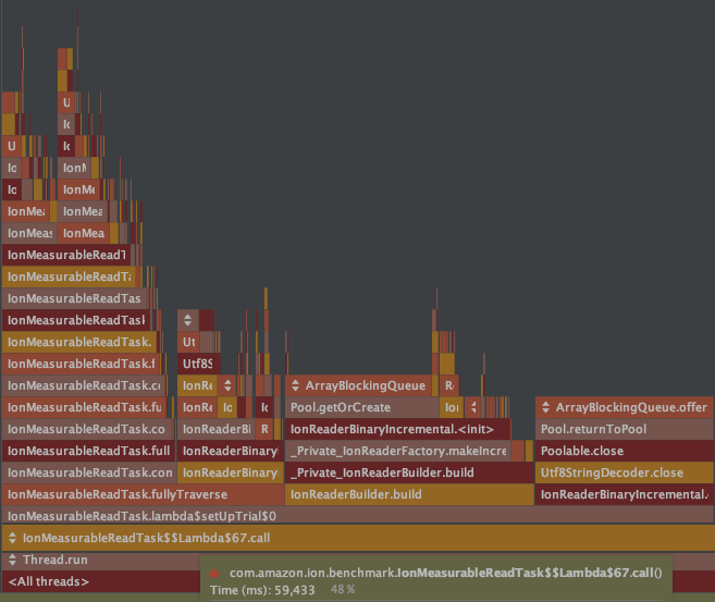 I tested the performance by reading a small binary Ion payload using 256 different threads simultaneously. My results did not capture much impact to raw performance, as is shown below.