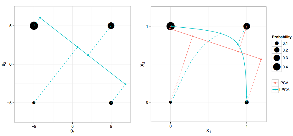 install_github("andland/logisticPCA")Three types of dimensionality reduction are given. For all the functions, the user must supply the desired dimension k. The data must be an n x d matrix comprised of binary variables (i.e. all 0's and 1's).