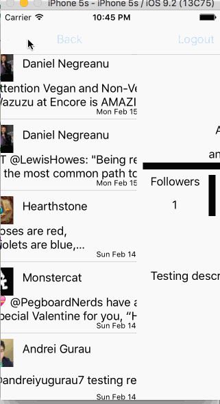 - Tweet Details Page: User can tap on a tweet to view it, with controls to retweet, favorite, and reply.