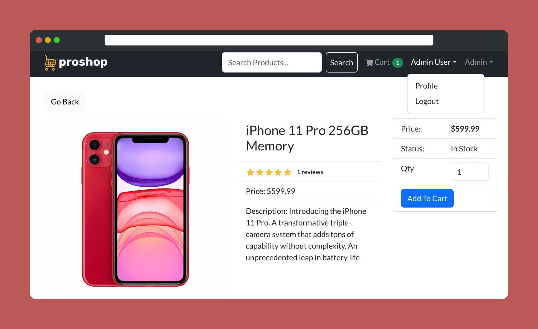 ProShop is a full-featured eCommerce platform with shopping cart, product search, admin panel area, product reviews, PayPal integration, and a multi-step checkout process.
