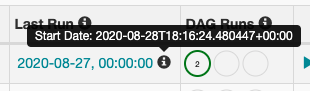 It has been reported that the last run's execution date was incorrectly being displayed for both the last run's link text as well as the "Start Date" in the (i) tooltip on the DAGs page. This was happening in the RBAC UI. For example, this was wrong, the "Start Date" was not