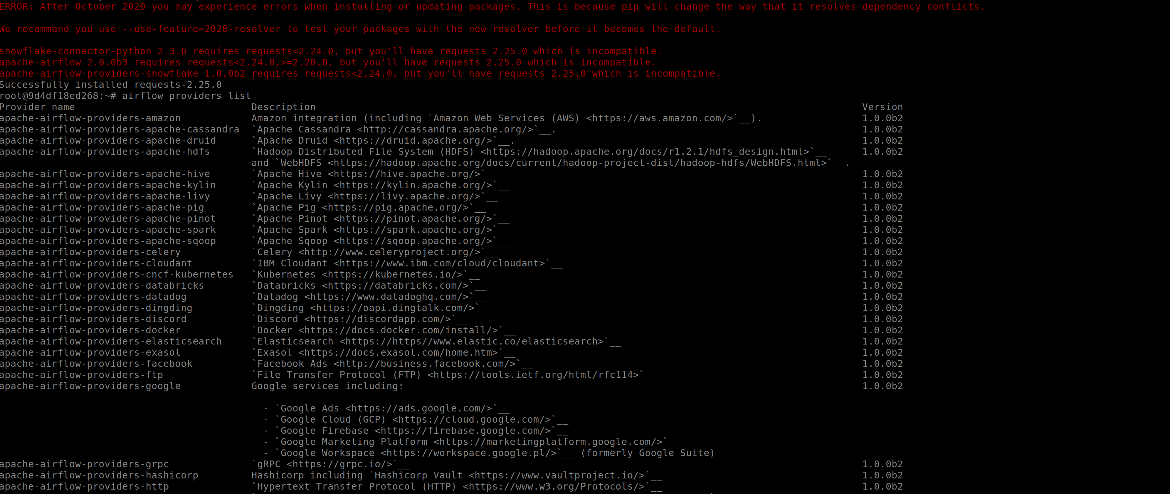 - BugFix: Tasks with ``depends_on_past`` or ``task_concurrency`` are stuck (apache#12663) - Fix issue with empty Resources in executor_config (apache#12633) - Fix: Deprecated config ``force_log_out_after`` was not used (apache#12661) - Fix empty asctime field in JSON formatted logs (apache#10515) - [AIRFLOW-2809] Fix security issue regarding Flask SECRET_KEY (apache#3651) - [AIRFLOW-2884] Fix Flask SECRET_KEY security issue in www_rbac (apache#3729) - [AIRFLOW-2886] Generate random Flask SECRET_KEY in default config (apache#3738) - Add missing comma in setup.py (apache#12790) - Bugfix: Unable to import Airflow plugins on Python 3.8 (apache#12859) - Fix setup.py missing comma in ``setup_requires`` (apache#12880) - Don't emit first_task_scheduling_delay metric for only-once dags (apache#12835) - Update setup.py to get non-conflicting set of dependencies (apache#12636) - Rename ``[scheduler] max_threads`` to ``[scheduler] parsing_processes`` (apache#12605) - Add metric for scheduling delay between first run task & expected start time (apache#9544) - Add new-style 2.0 command names for Airflow 1.10.x (apache#12725) - Add Kubernetes cleanup-pods CLI command for Helm Chart (apache#11802) - Don't let webserver run with dangerous config (apache#12747) - Replace pkg_resources with importlib.metadata to avoid VersionConflict errors (apache#12694) - Clarified information about supported Databases