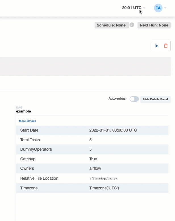 - Remove details panel title - Add button to reset root - Make "More Details" buttons more specific - Specify timezone as DAG timezone