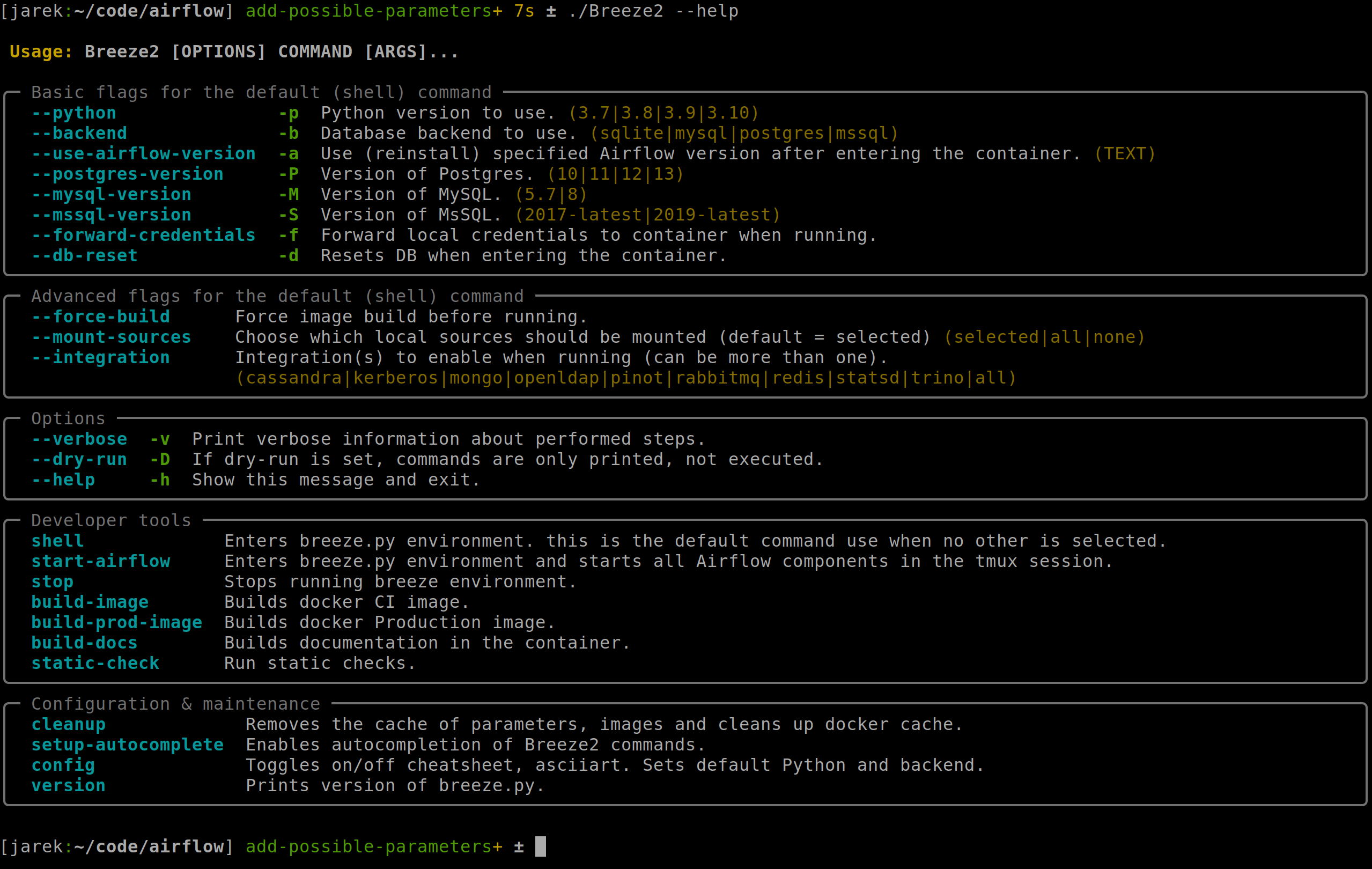 This is a review and clean-up for all the parameters and commands for Breeze2 in order to prepare it for being used by the contribugors. There are various small fixes here and there, removal of duplicated code, refactoring and moving code around as well as cleanup and review all the parameters used for all implemented commands. The parameters, default values and their behaviours were updated to match "new" life of Breeze rather than old one. Some improvements are made to the autocomplete and click help messages printed. Full list of choices is always displayed, parameters are groups according to their target audience, and they were sorted according to importance and frequency of use. Various messages have been colourised according to their meaning - warnings as yellow, errors as red and informational messages as bright_blue. The `dry-run` option has been added to just show what would have been run without actually running some potentially "write" commands (read commands are still executed) so that you can easily verify and manually copy and execute the commands with option to modify them before. The `dry_run` and `verbose` options are now used for all commands. The "main" command now runs "shell" by default similarly as the original Breeze. All "shortcut" parameters have been standardized - i.e common options (verbose/dry run/help) have one and all common flags that are likely to be used often have an assigned shortcute. The "stop" and "cleanup" command have been added as they are necessary for average user to complete the regular usage cycle. Documentation for all the important methods have been updated.