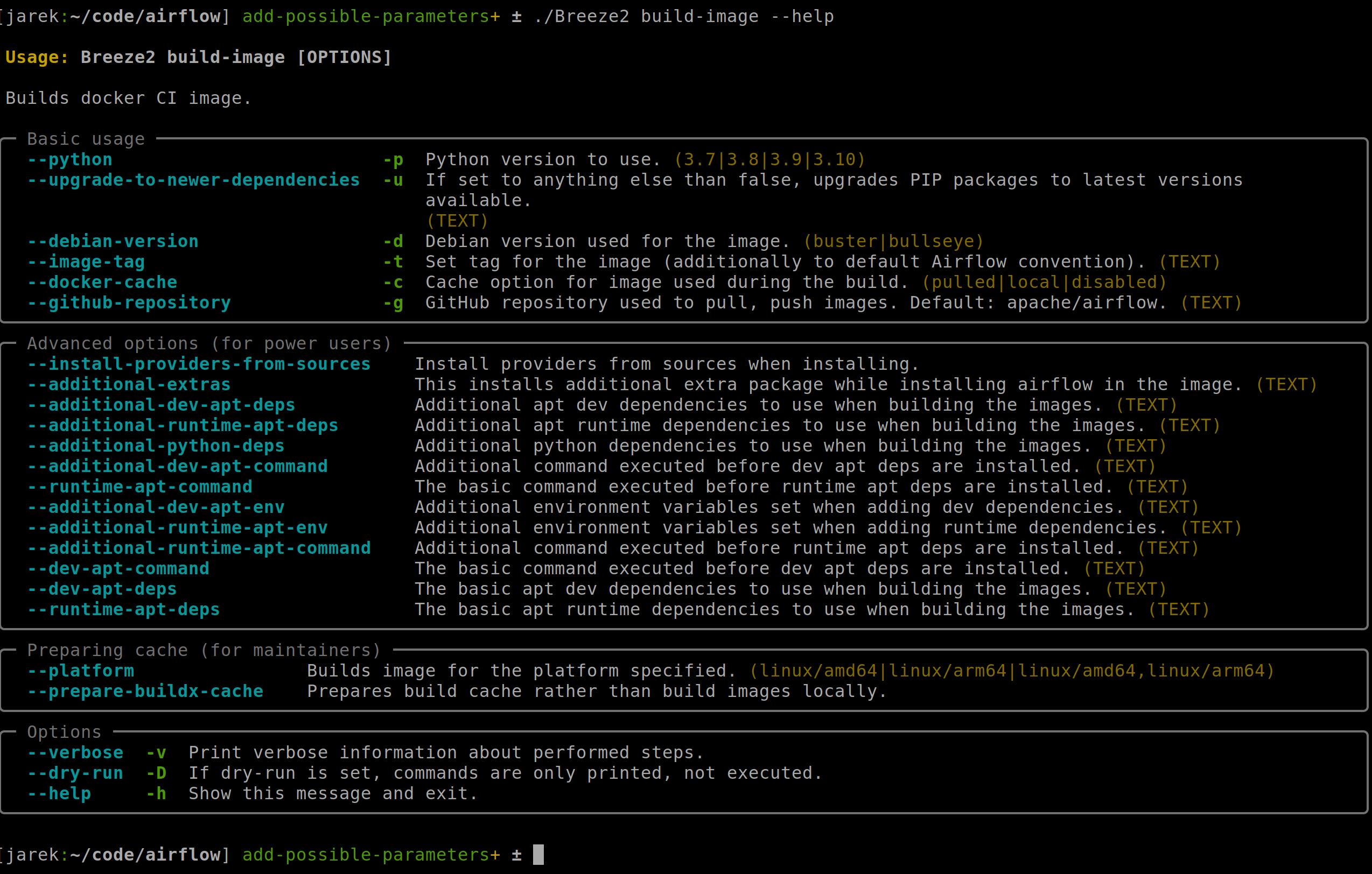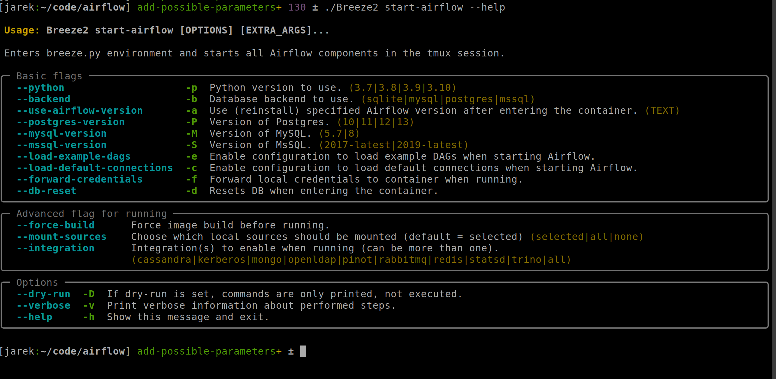 cc: @Bowrna @edithturn -> I have deeeply reviewed, tested and cleaned up the changes. This is really cool what we have, after I removed some duplications, cleaned up some naming, added some docstrings and reviewed and made sure all the parameters we have, we are 100% ready to replace old breeze and move the old breeze to legacy. This will be the next PR after the #22695 and this one is merged. My changes were mostly about beautifying things, refactoring/shuffling them around so that they make more sense and making sure we have no duplications. All the rest remained largely as You've implemented it. FANTASTIC JOB. Some cool screenshots follow. |