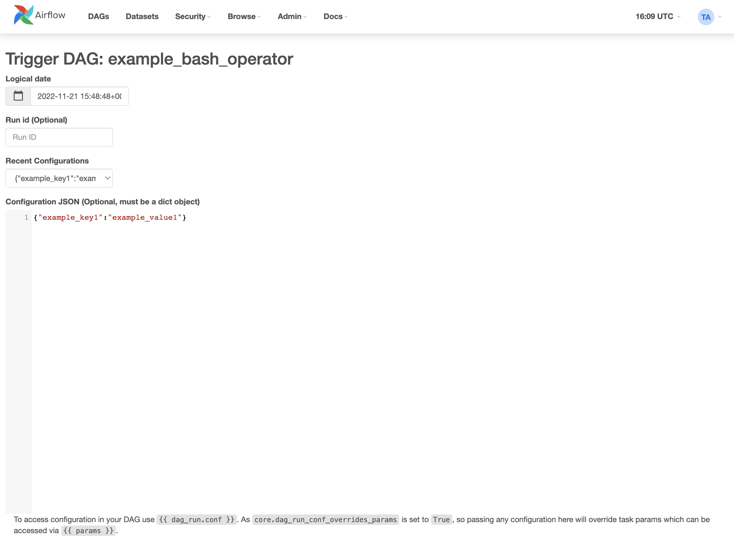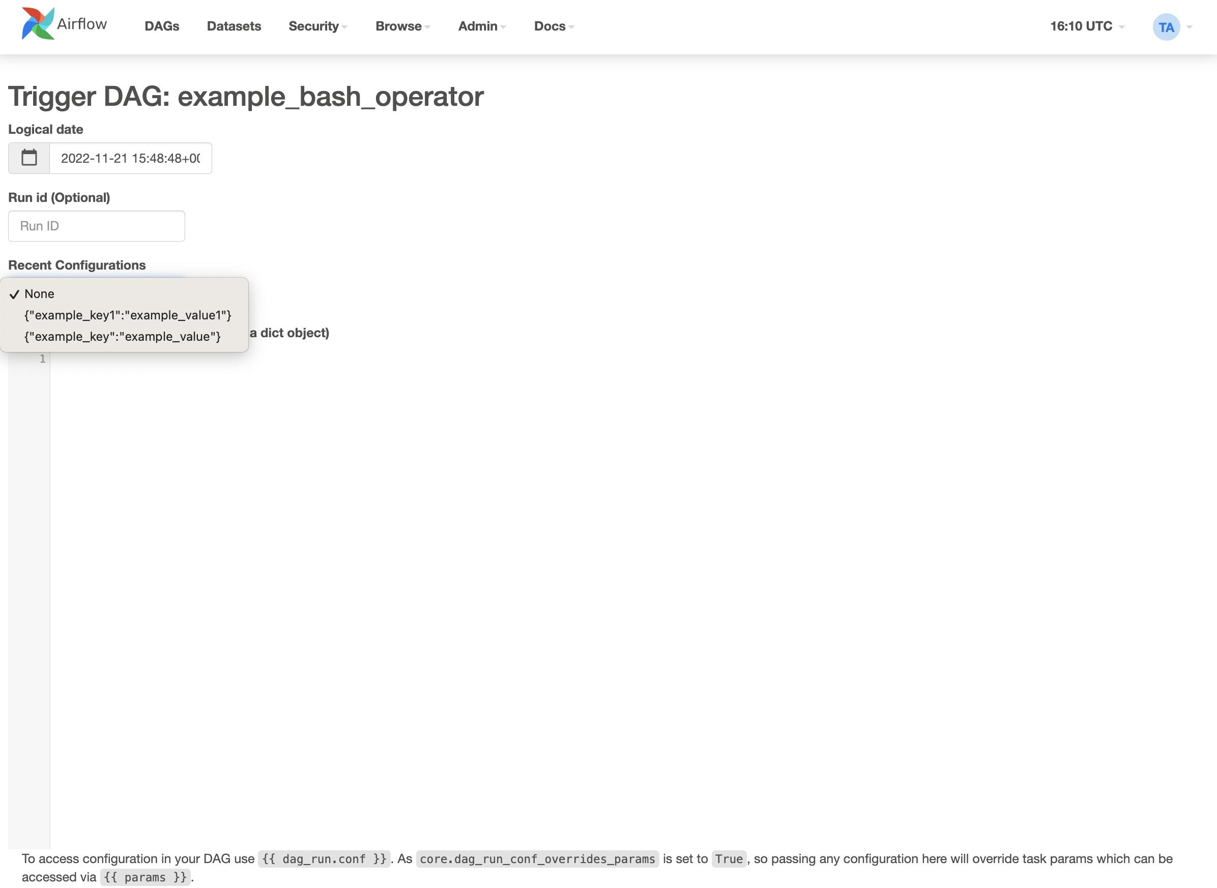 Hello @jh242, Thank you for the update :) Here you are loading the grid_data info (which has a lot of extra stuff on task instances etc.), just to retrieve the 'configs'. As you said you could end up with less than 10 confs (because of duplicate), or even with no conf at all if the last 10 run were scheduled. Here we statically render a template, there is usually no need to go through an API call. What you could do is, inside the view that renders the You can check the Maybe I missed something, but this should make the code even cleaner and simple :) |