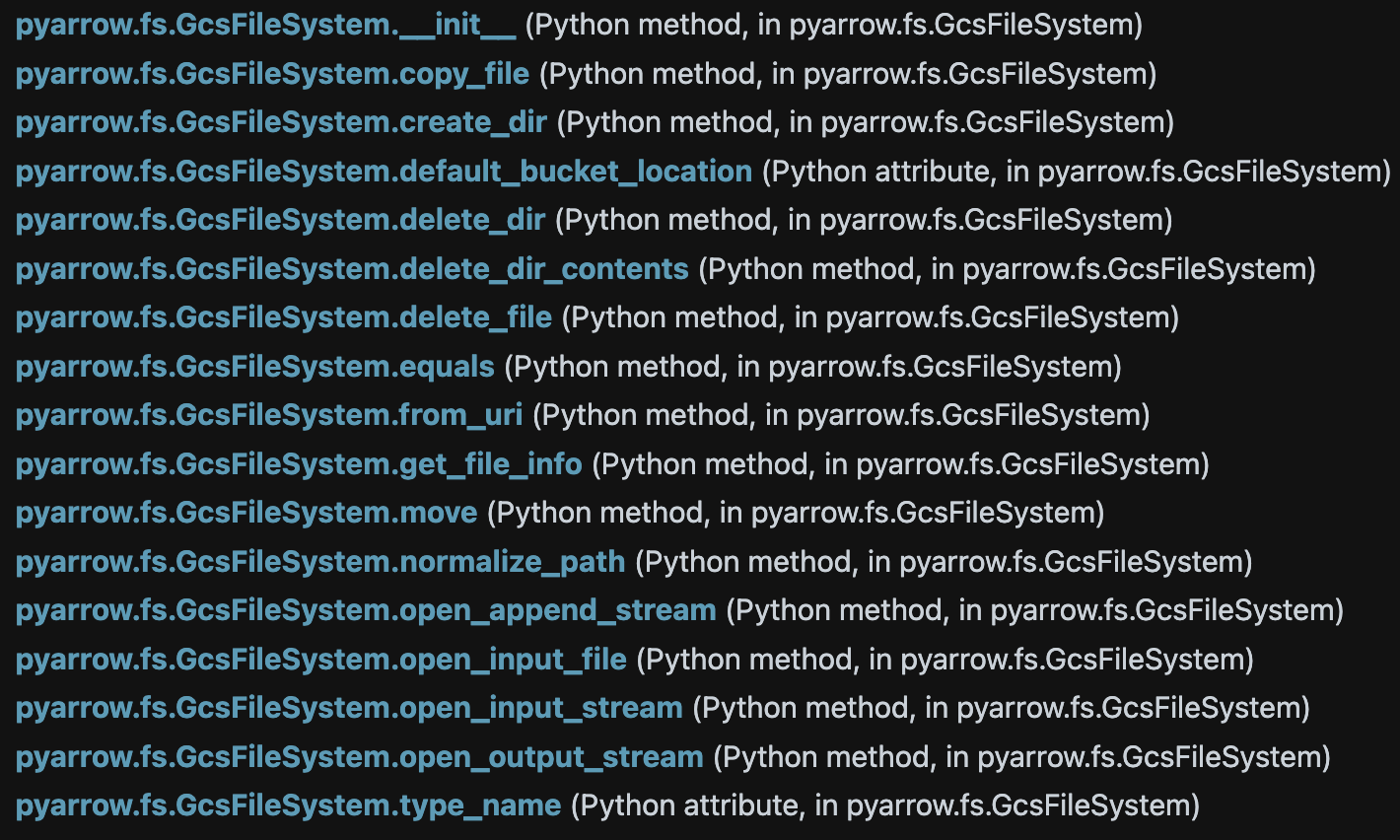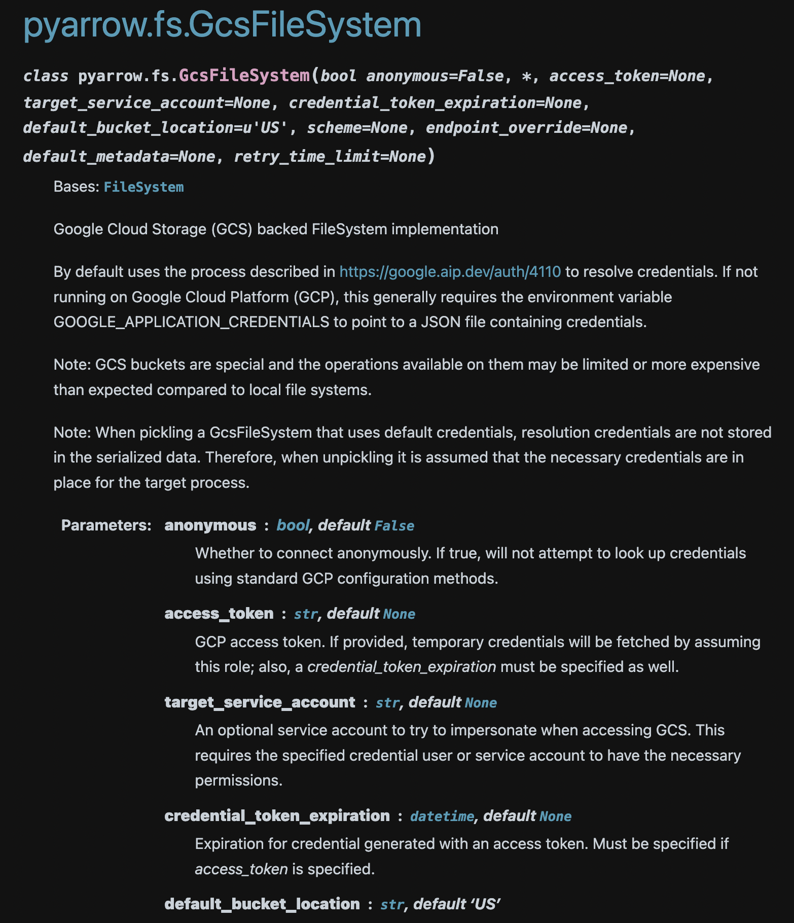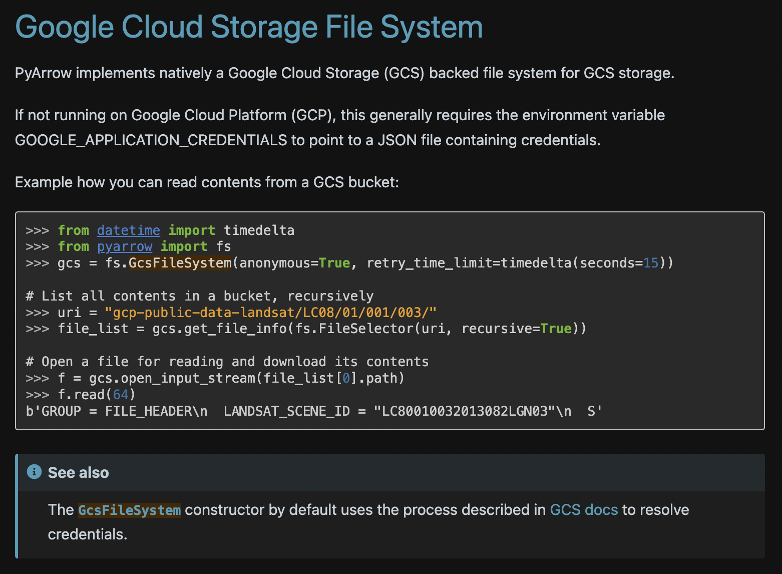 Thanks for the suggestions @wjones127! I've added retry limit, anonymous connection and recursive parameters to the example, but didn't specifically comment on it. @emkornfield already wrote the docs, this mostly enables building them, with the exception of adding this example: This now renders: And: |