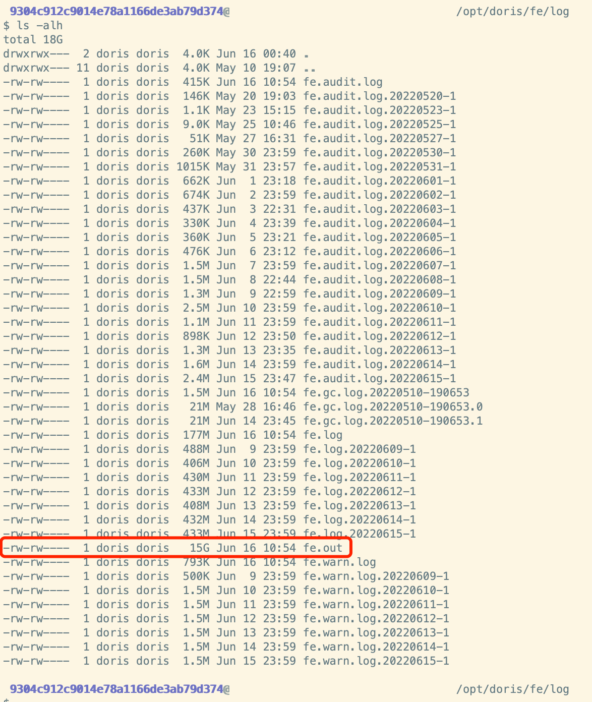 ### Search before asking - [X] I had searched in the [issues](https://github.com/apache/incubator-doris/issues?q=is%3Aissue) and found no similar issues. ### Description As time goes on,the fe.out log file size will get bigger and bigger, in my practice, it has reached 15GB <img width="587" alt="image" src="https://user-images.githubusercontent.com/9734567/173993172-e665240e-87e1-41ea-965f-5ef5ee7447e9.png"> ### Solution _No response_ ### Are you willing to submit PR? - [ ] Yes I am willing to submit a PR! ### Code of Conduct - [X] I agree to follow this project's [Code of Conduct](https://www.apache.org/foundation/policies/conduct)