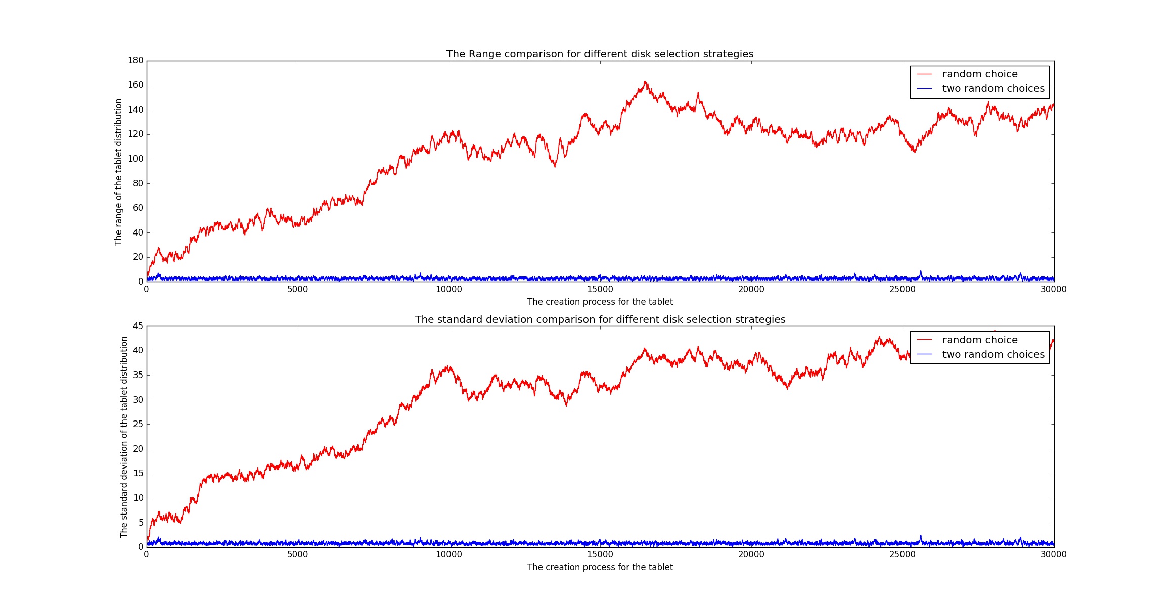 In the initial state, the distribution of tablets among different disks is balanced. The simulation experiments show that the distribution of tablets on different disks in the BE node always remains relatively balanced with the creation of tablets after used the "two random choices" disk selection algorithm. (The top figure shows the range(极差) trend of tablet distribution on different disks in a BE node with the creation of tablets. The bottom figure shows the standard deviation(标准差) trend of tablet distribution on different disks in a BE node with the creation of tablets. In these two figures, the red line indicates the random disk selection strategy used in doris for tablet creation and the blue line indicates "two random choices" disk selection strategy we introduced for tablet creation )