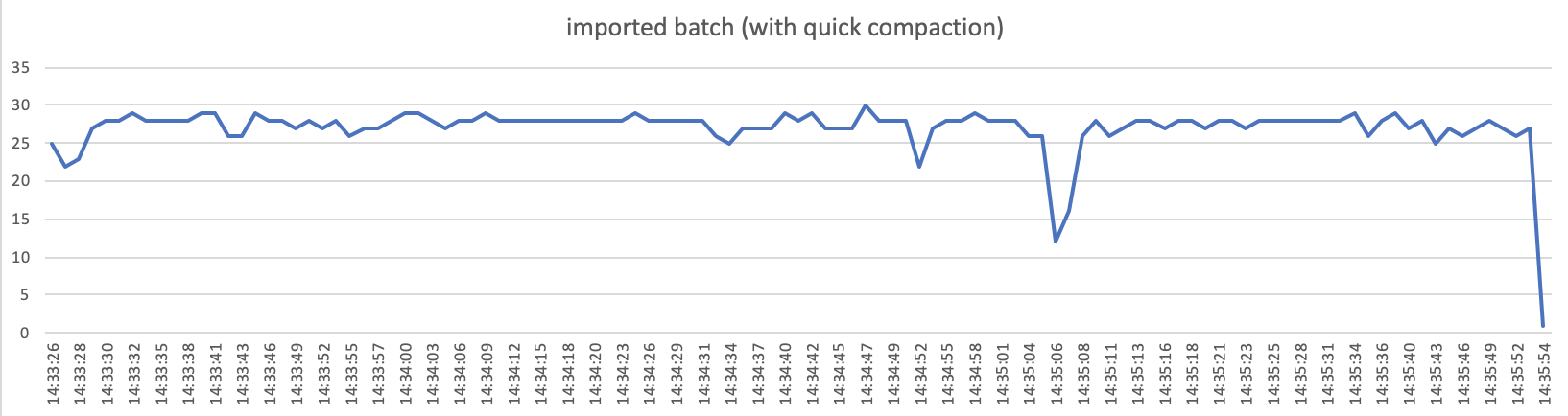 start 30 threads ,every thread import 100 batch, every batch included 500-1000 rows, the result:
