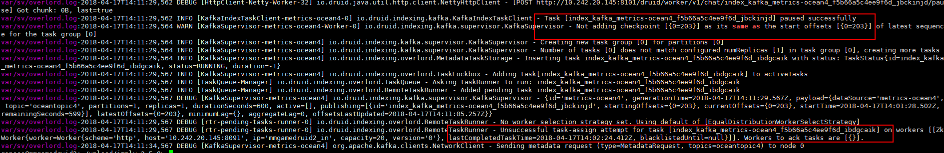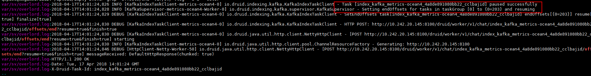 I set process overlord log to debug. When index task(middleMgr) paused, overload will send offset/end to index task to publish segments.
