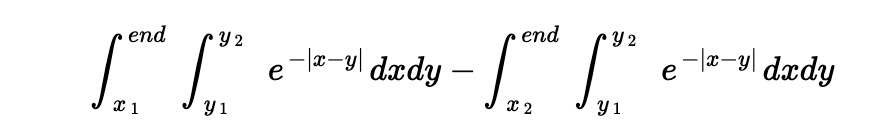 Each of the six cases for alignment of <x, end>, <y1, y2> has a different reduced form for the integral and the sum over all these cases gives the overall cost.