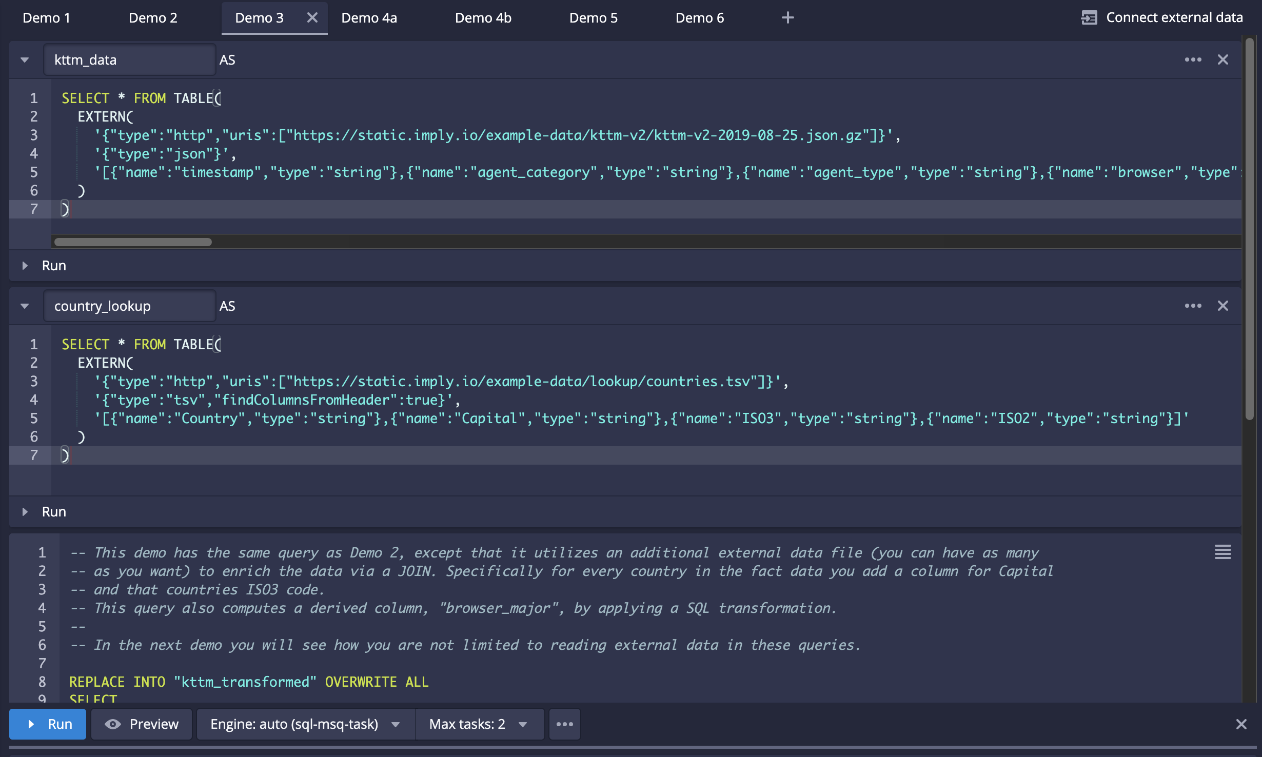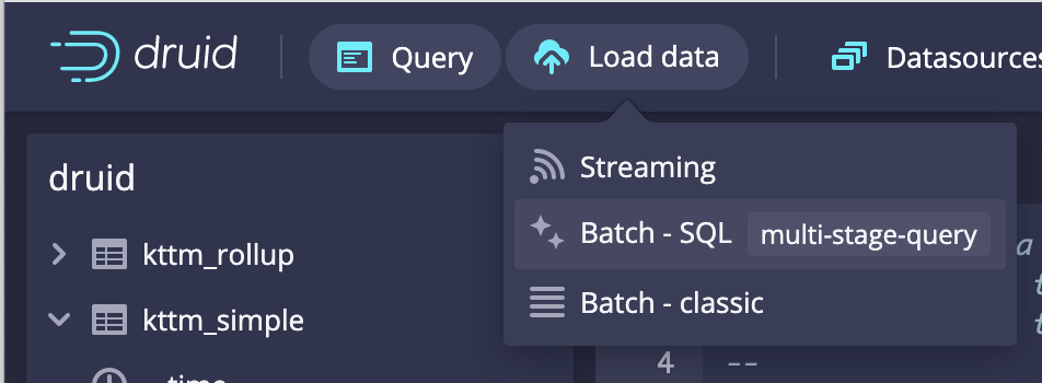 What is the difference between the SQL-based data loader and the "Connect external data" flow? They start off exactly the same, they figure out the source and format to use and generate the external. After the external has been defined the "Connect external data" flow generates a seed query that you can then edit as you wish. The key point is that (unless you just want to ingest with the seed query) you must edit a rather complex SQL statement and preview it using the "Preview" functionality that is not sub-second (it reached out to the data for every preview). On the other hand the data loader let's you manipulate the (SQL) ingestion spec completely with point-and-click it also samples the data and lets you preview it using sql-native making the previews sub-second. The SQL data loader limits you to what kind of query you can write, for example you can not currently use it to express a query involving a JOIN, but at any point in time it lets you take your query to the regular query view so there is no need to worry about being restricted.