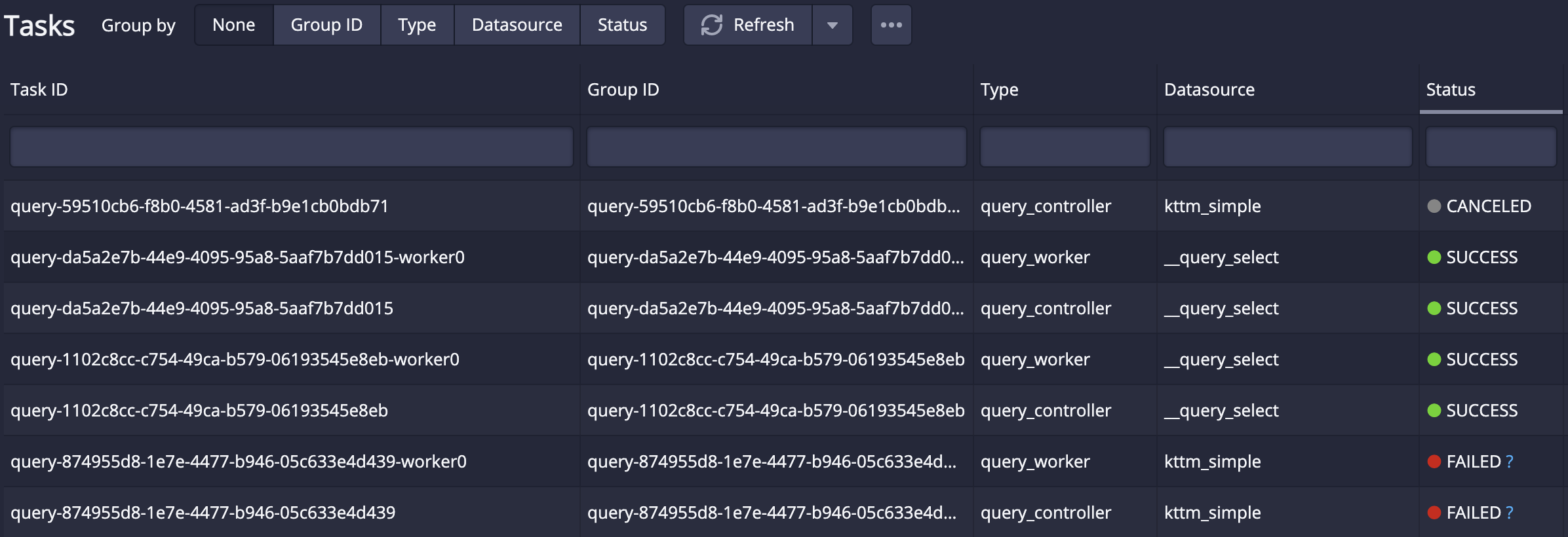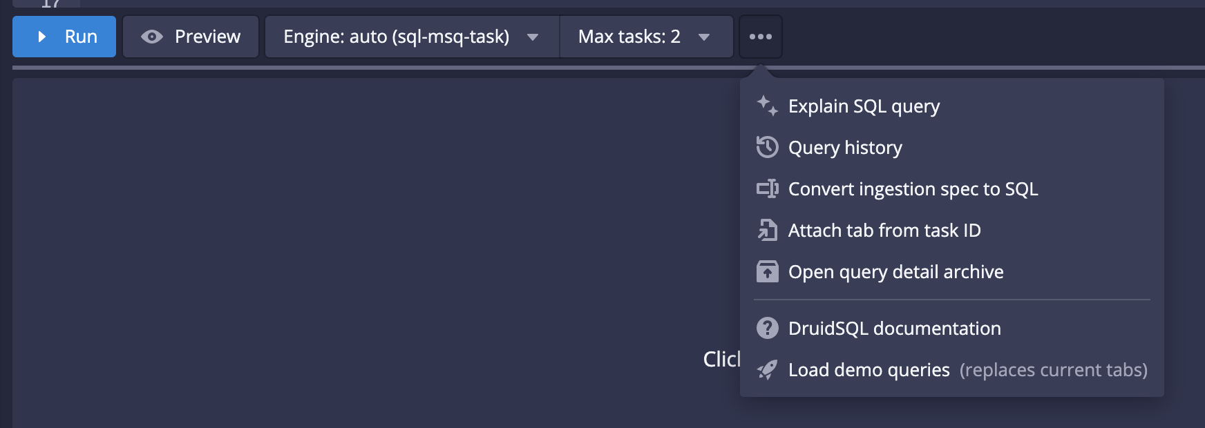 /druid/v2/sql/taskand/druid/indexer/v1/task/*APIs as well as native and sql-native queries just like the old Query view. A key point of the sql-msq-task based queries is that they may run for a long time. This inspired / necessitated many UX changes including (but not limited to):Tabs