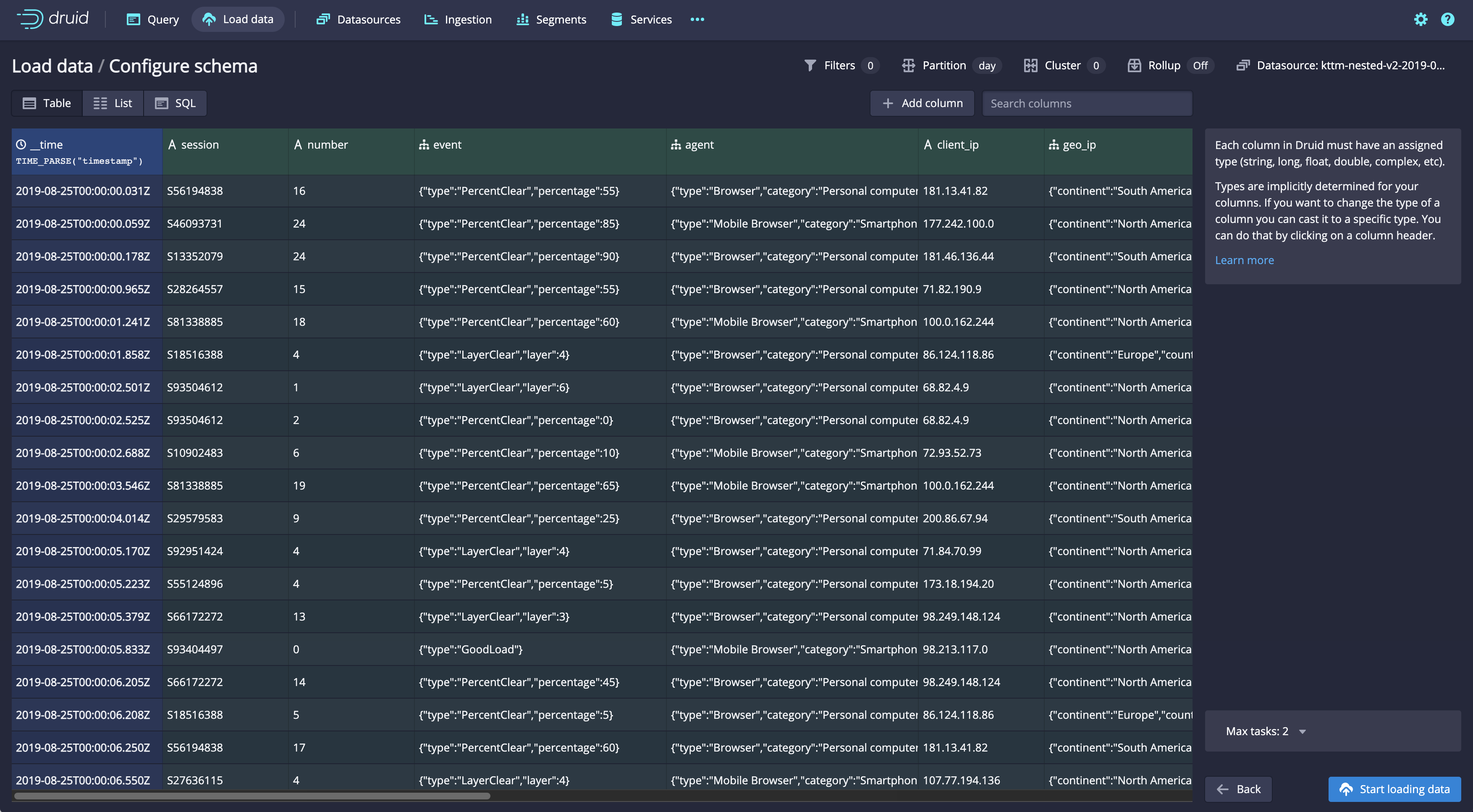 The data loader exists as a GUI wizard to help users craft a JSON ingestion spec using point and click and quick previews.