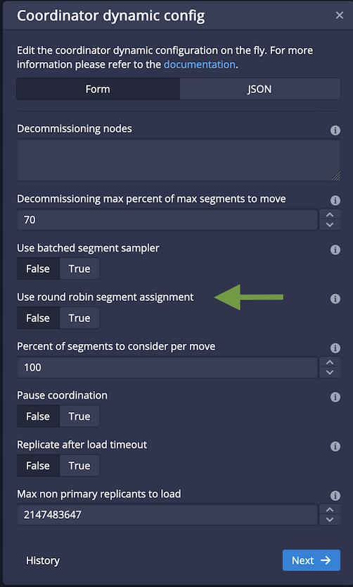 useRoundRobinSegmentAssignmentwith default value falseRoundRobinServerSelector. This does not implement theBalancerStrategyas it does not conform to that contract and may also be used in conjunction with a