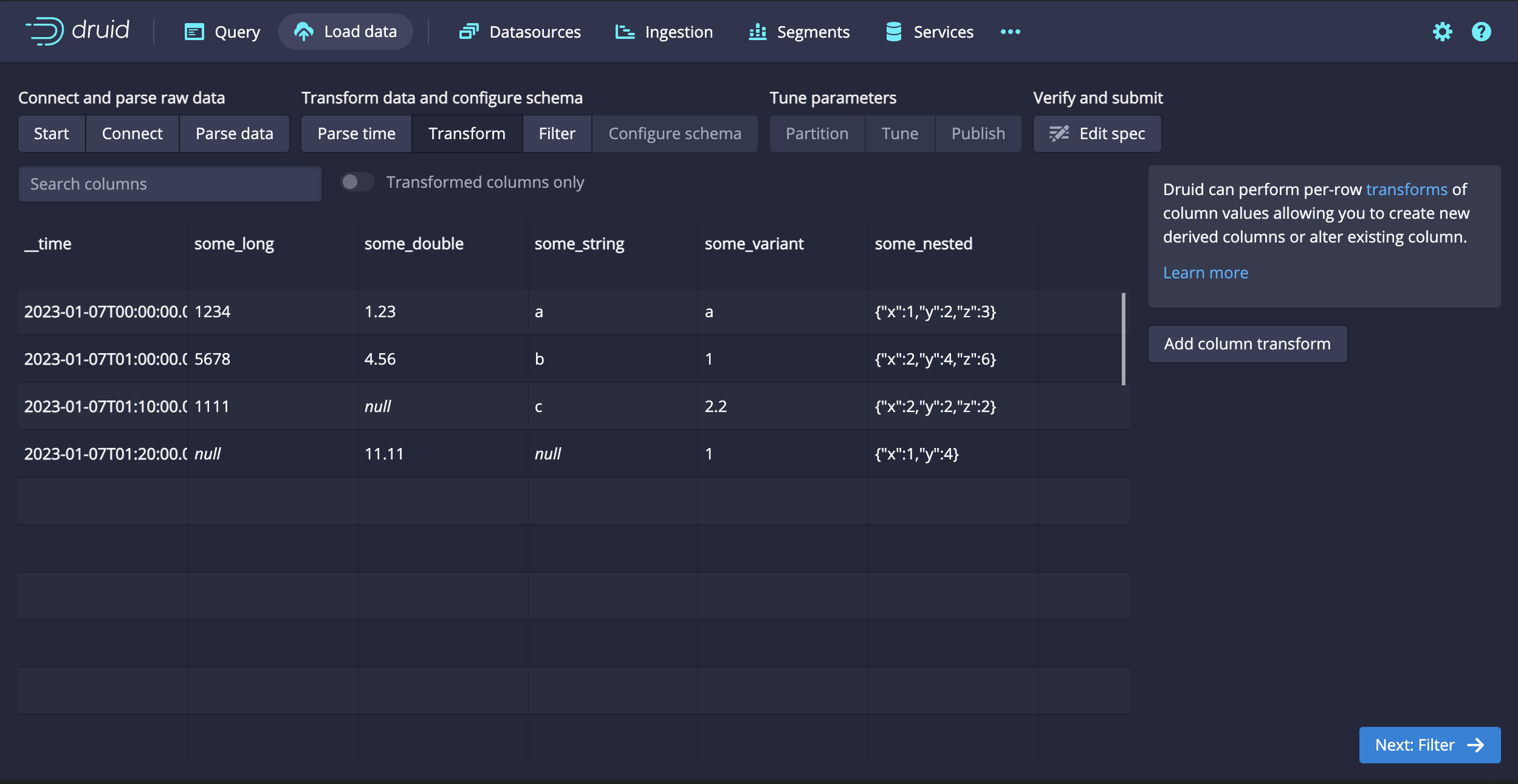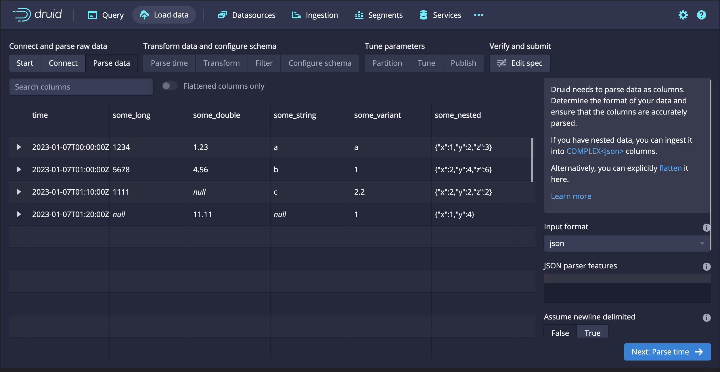 { "numRowsRead":4, "numRowsIndexed":4, "logicalDimensions":[ {"type":"string","name":"time","multiValueHandling":"SORTED_ARRAY","createBitmapIndex":true}, {"type":"long","name":"some_long","multiValueHandling":"SORTED_ARRAY","createBitmapIndex":false}, {"type":"double","name":"some_double","multiValueHandling":"SORTED_ARRAY","createBitmapIndex":false}, {"type":"string","name":"some_string","multiValueHandling":"SORTED_ARRAY","createBitmapIndex":true}, {"type":"json","name":"some_variant","multiValueHandling":"SORTED_ARRAY","createBitmapIndex":true}, {"type":"json","name":"some_nested","multiValueHandling":"SORTED_ARRAY","createBitmapIndex":true} ], "physicalDimensions":[ {"type":"json","name":"time","multiValueHandling":"SORTED_ARRAY","createBitmapIndex":true}, {"type":"json","name":"some_long","multiValueHandling":"SORTED_ARRAY","createBitmapIndex":true}, {"type":"json","name":"some_double","multiValueHandling":"SORTED_ARRAY","createBitmapIndex":true}, {"type":"json","name":"some_string","multiValueHandling":"SORTED_ARRAY","createBitmapIndex":true}, {"type":"json","name":"some_variant","multiValueHandling":"SORTED_ARRAY","createBitmapIndex":true}, {"type":"json","name":"some_nested","multiValueHandling":"SORTED_ARRAY","createBitmapIndex":true} ], "logicalSegmentSchema":[ {"name":"__time","type":"LONG"}, {"name":"time","type":"STRING"}, {"name":"some_long","type":"LONG"}, {"name":"some_double","type":"DOUBLE"}, {"name":"some_string","type":"STRING"}, {"name":"some_variant","type":"COMPLEX<json>"}, {"name":"some_nested","type":"COMPLEX<json>"} ], "data":[...] }which evolves as we proceed through data loader steps: