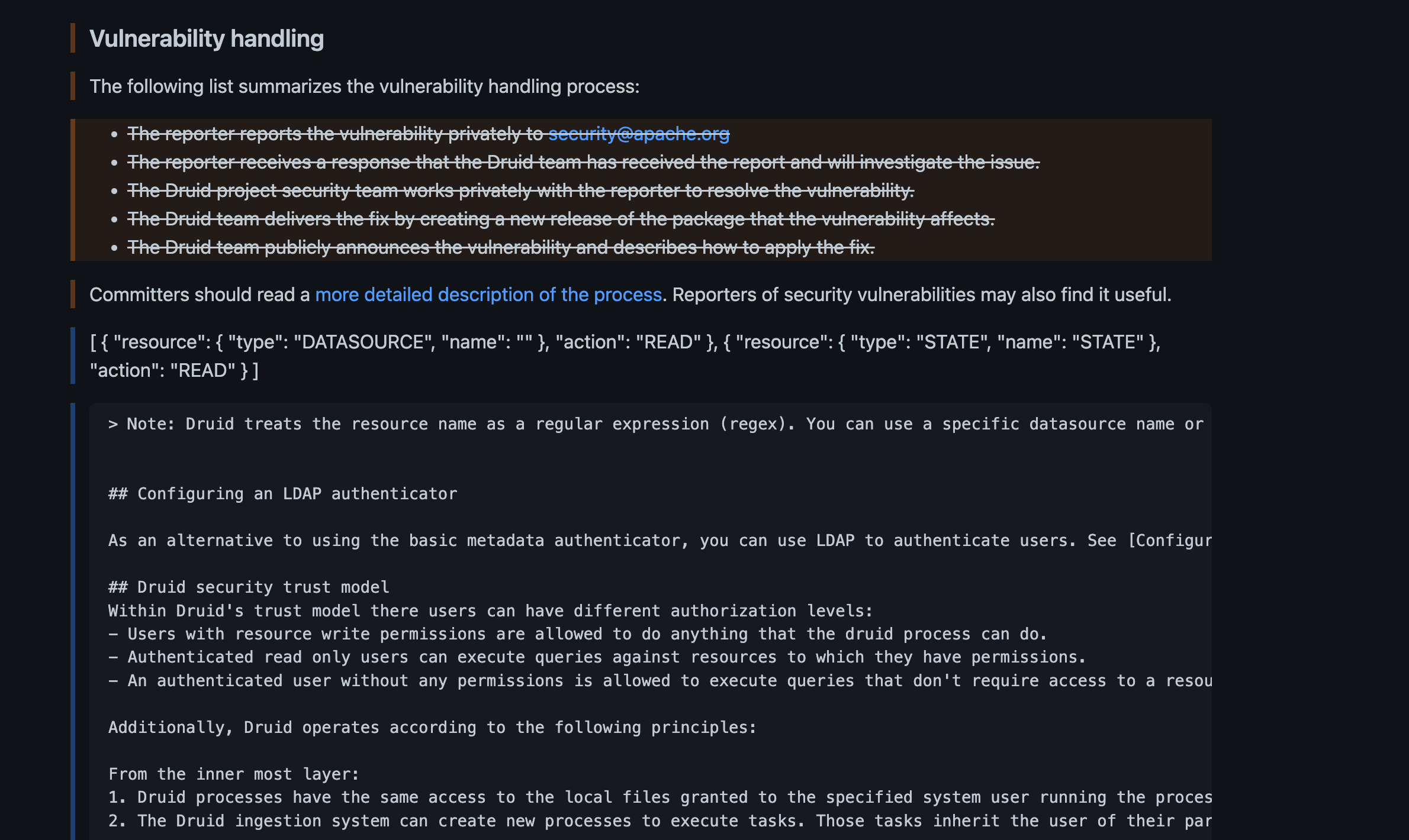 | > Note: Druid treats the resource name as a regular expression (regex). You can use a specific datasource name or regex to grant permissions for multiple datasources at a time. | ||