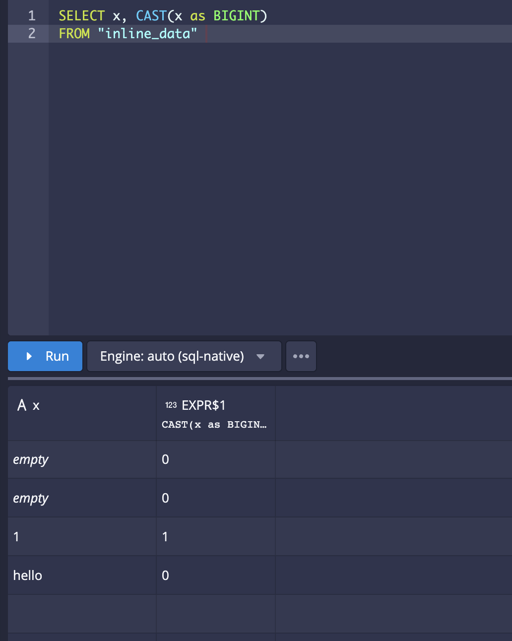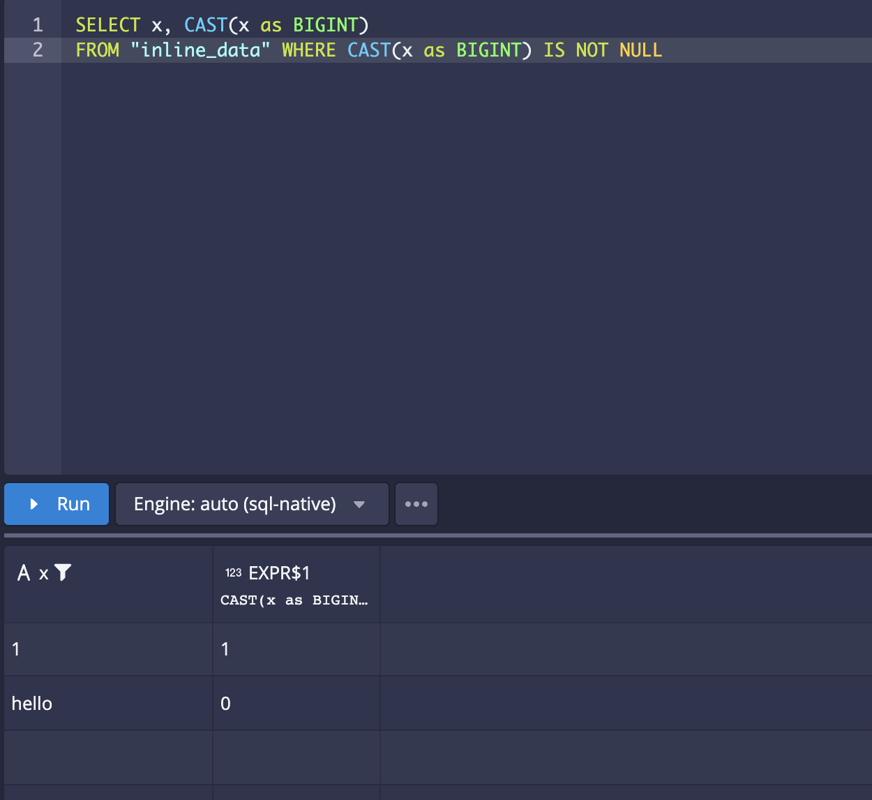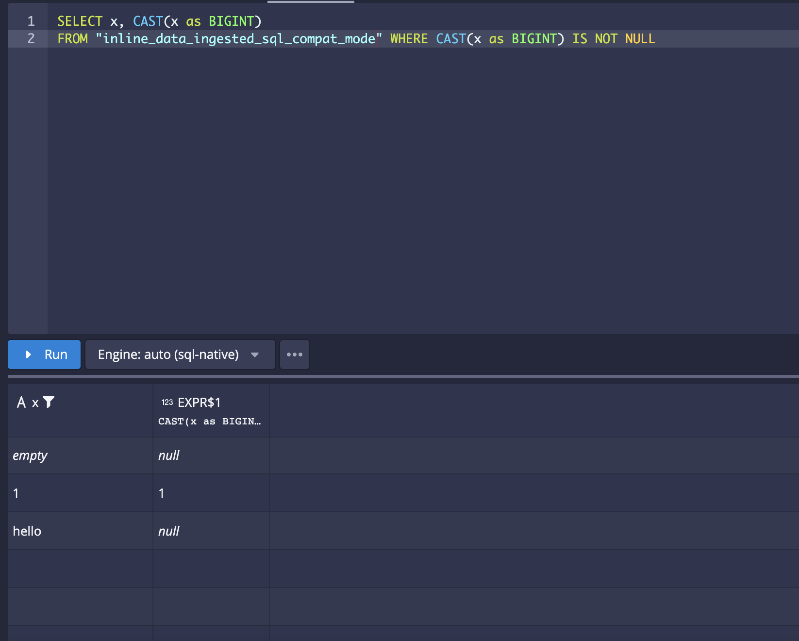 IS NULL/IS NOT NULLon values which are coerced to a numeric type, such asCAST(x AS BIGINT)orJSON_VALUE(nested, '$.x' RETURNING BIGINT). While these expressions had different causes, the underlying effect was more or less the same and involved the query engine using the null value index for the underlying column to build the cursor, which only counts the null string values, and misses out on values which might become null after coercion.For example given the following source data: