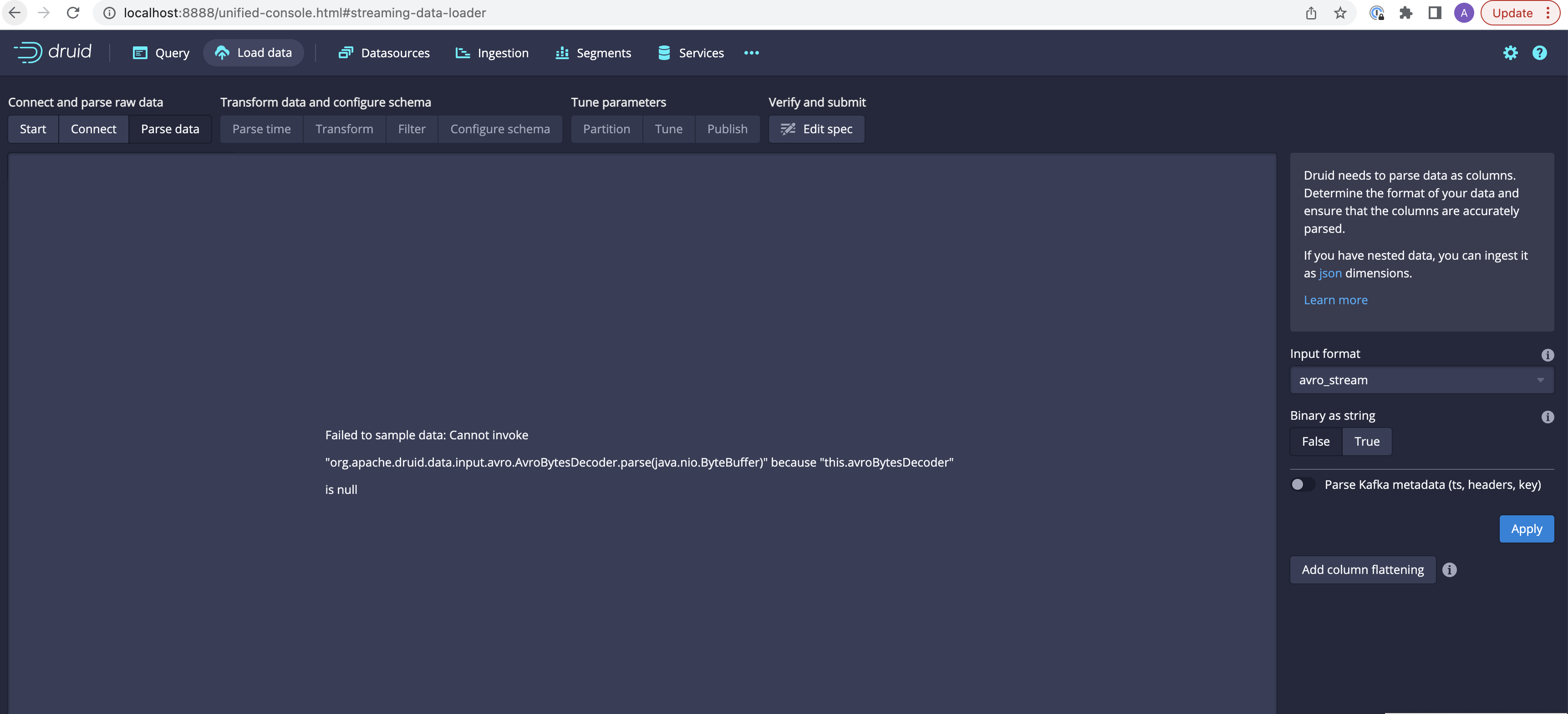 avroBytesDecoderis missing in the sampling spec. This is the default behavior from the Druid web console when sampling Avro Kafka streams, unless you manually edit the spec to add in the required property.The NPE stacktrace: