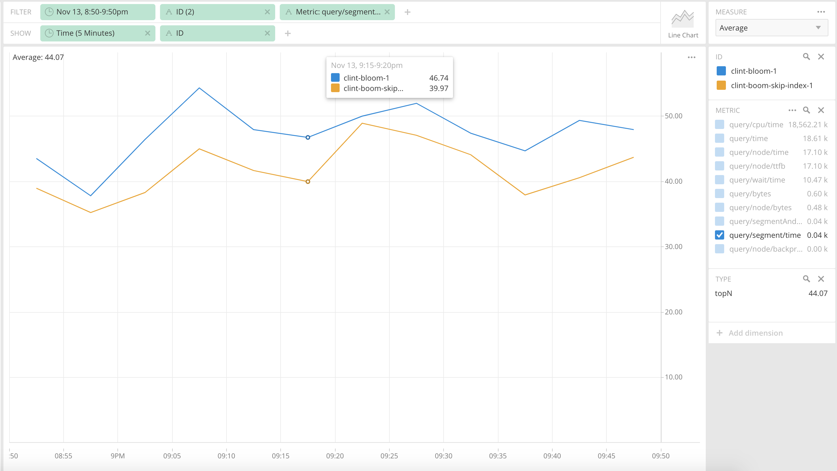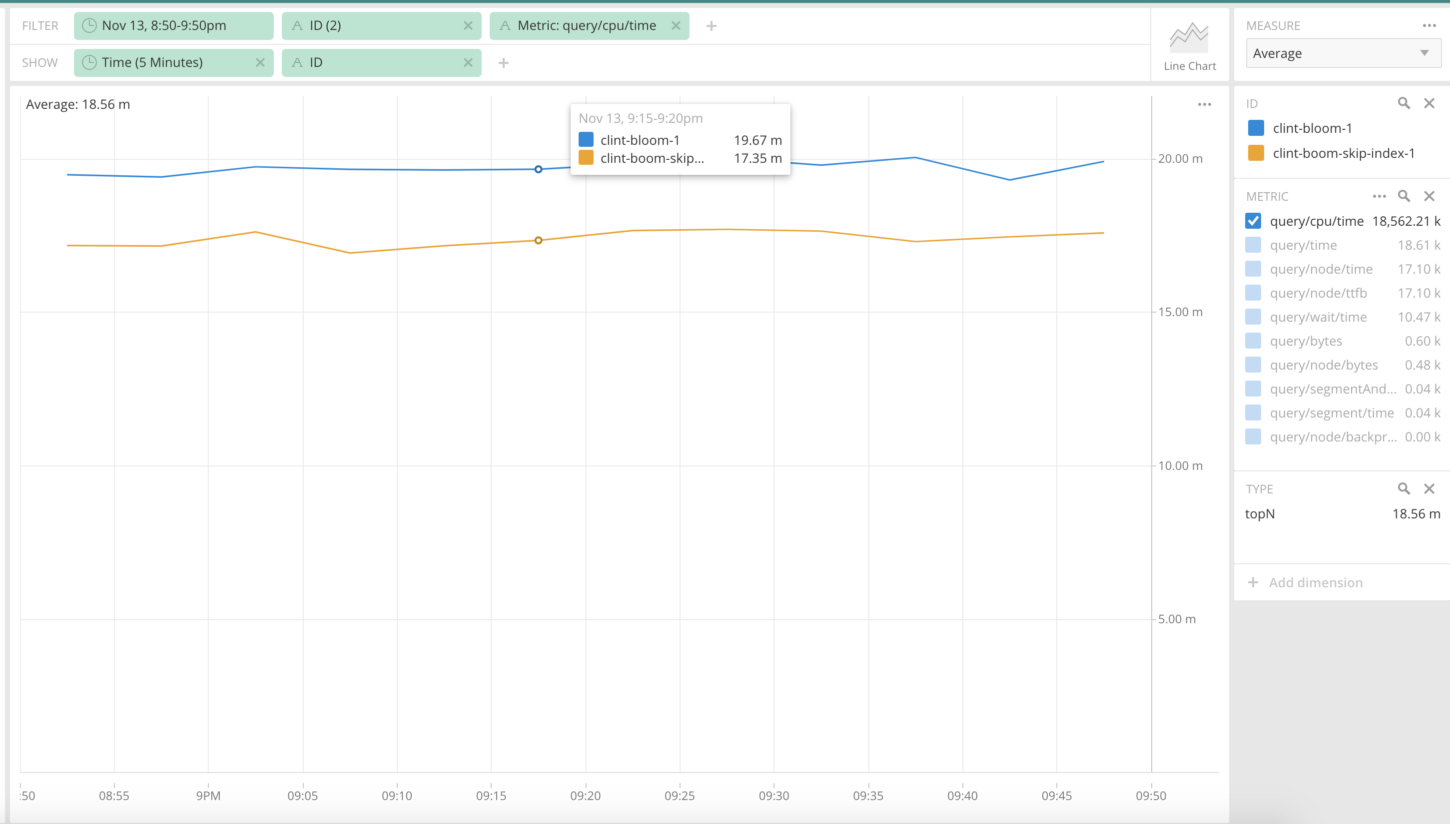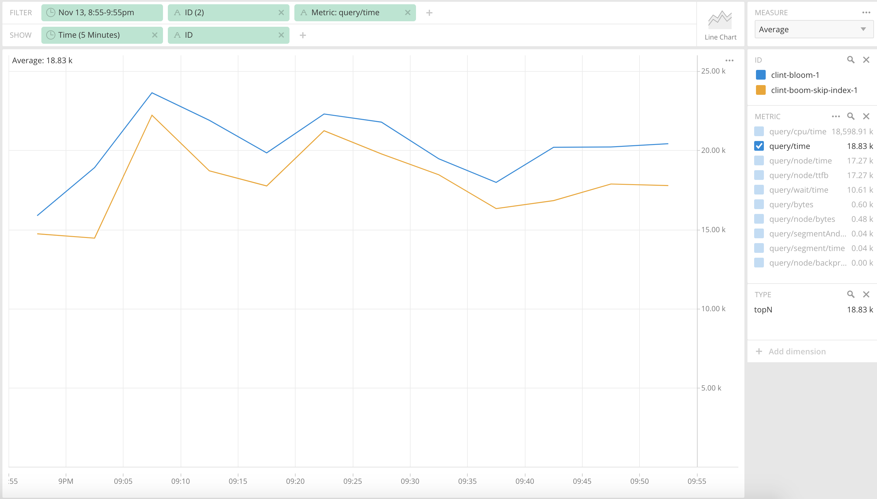 useBitmapIndexparameter tofalseis making the assumption that these sorts of filters will be more useful on such higher cardinality dimensions, but I can default the value totrueto preserve existing behavior if preferred, and I think optimally this value would probably be adaptive based on cardinality.Metrics collected by continuously running identical bloom filter queries differing only in the value for