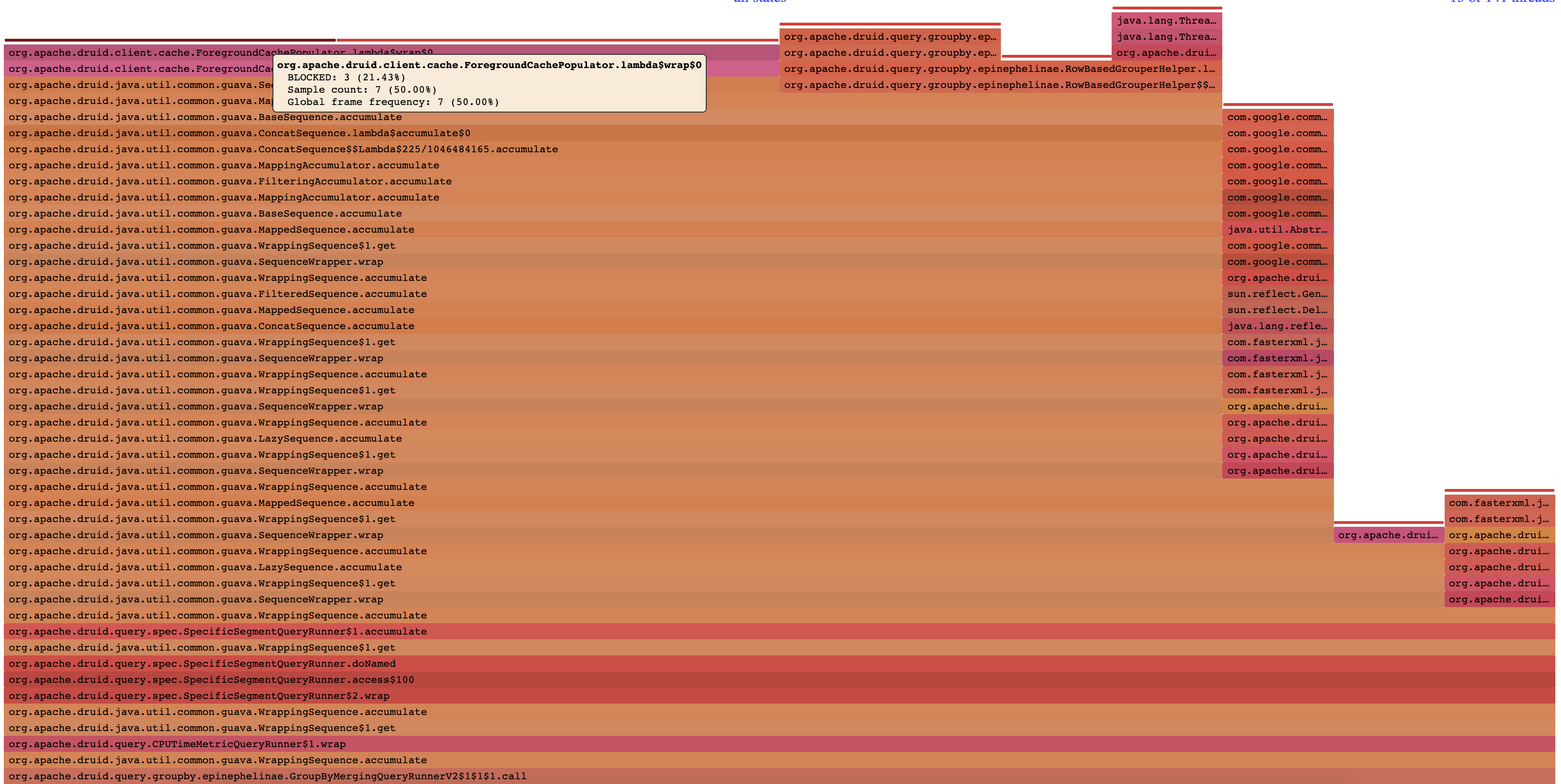 ForegroundTaskRunner, removing a synchronized block that appears to be unnecessary, sinceCachePopulatoris shared by all processing threads but the lock covers bytes and json generator that are tied to a specific segment which should only be happening in a single thread.Observed a lot of time being spent in