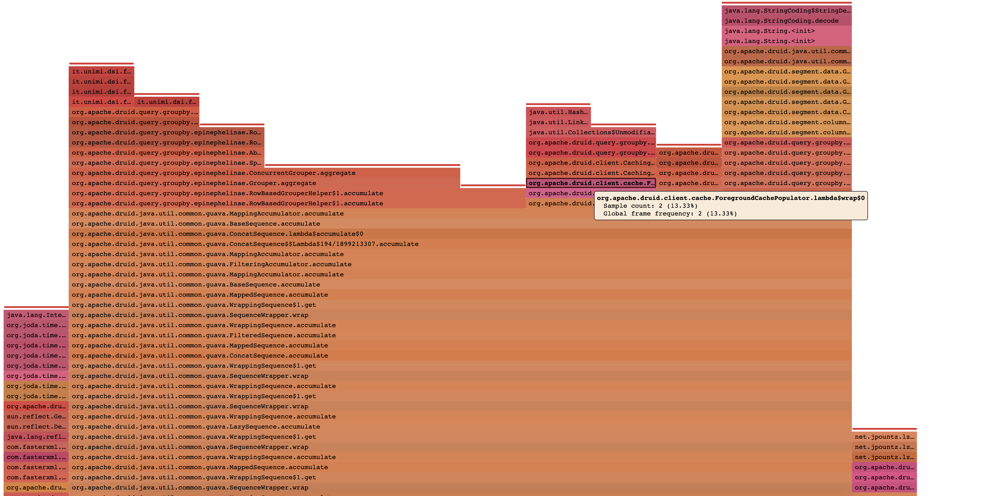 This was sampled and the flame graph generated with swiss java knife sample: flame graph: which spits out that html page you can interact with. The flame graph generation can also apparently work with VisualVM and flight recorder output as well, but I haven't tried it (just encountered this tool this week). |