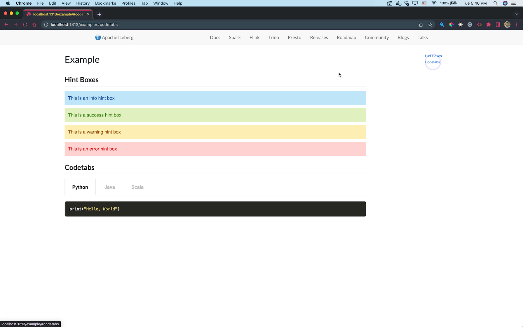 This adds some shortcodes to the landing-page theme that allows us to include hint-boxes and codetabs (code blocks in a tabbed container for multiple languages). Here's an example of what this looks like:
