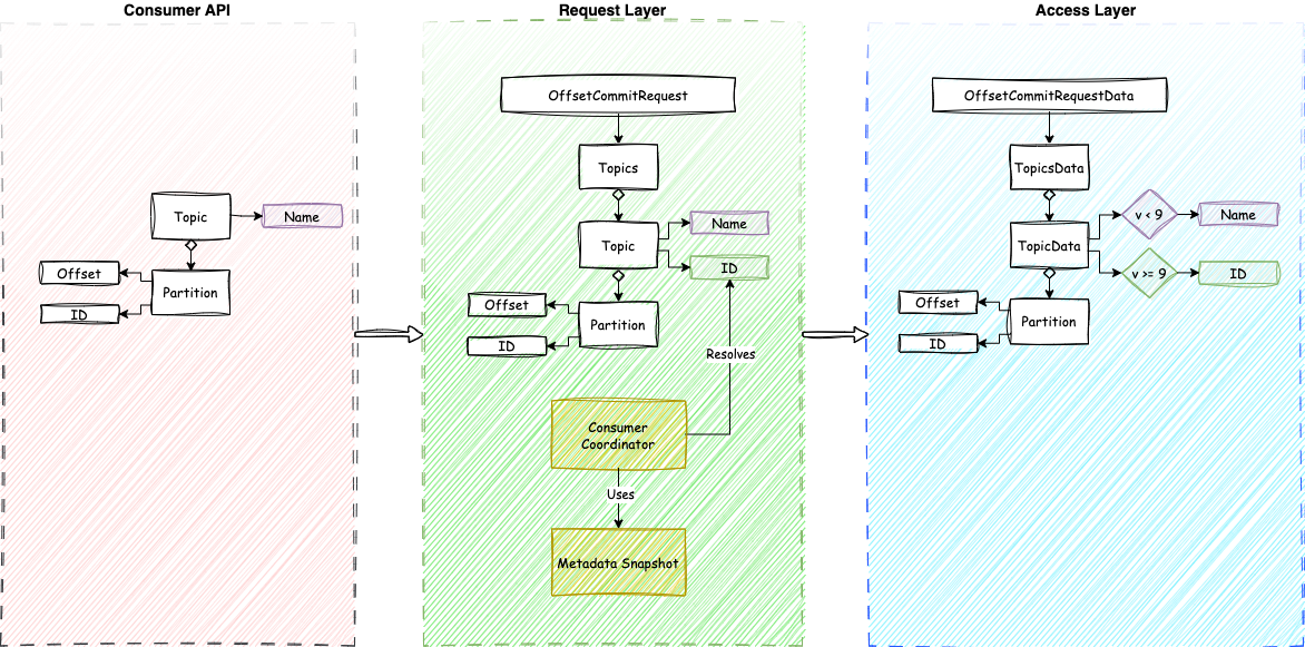 OffsetCommitrequests and responses. The approach chosen in the PR is to support references to topics by either their ID or name (but not both at the same time).Topic IDs are not surfaced to the Kafka consumer APIs.