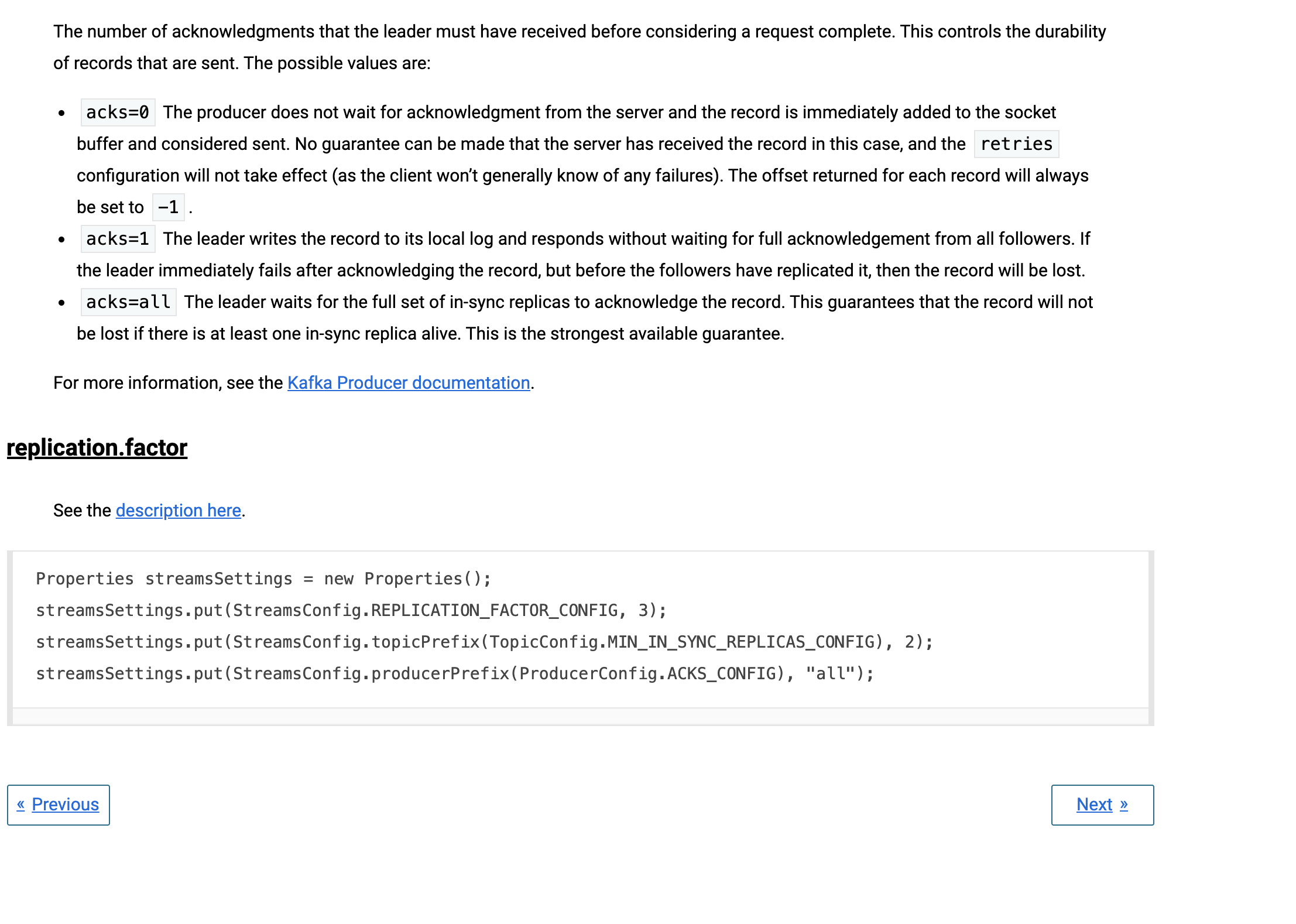 …231) - Documented how to set topic based configs - Documented how to achieve MIN_IN_SYNC_REPLICAS_CONFIG = 2 for reliable apps - cf apache/kafka#7346 Reviewer: Matthias J. Sax <matthias@confluent.io>