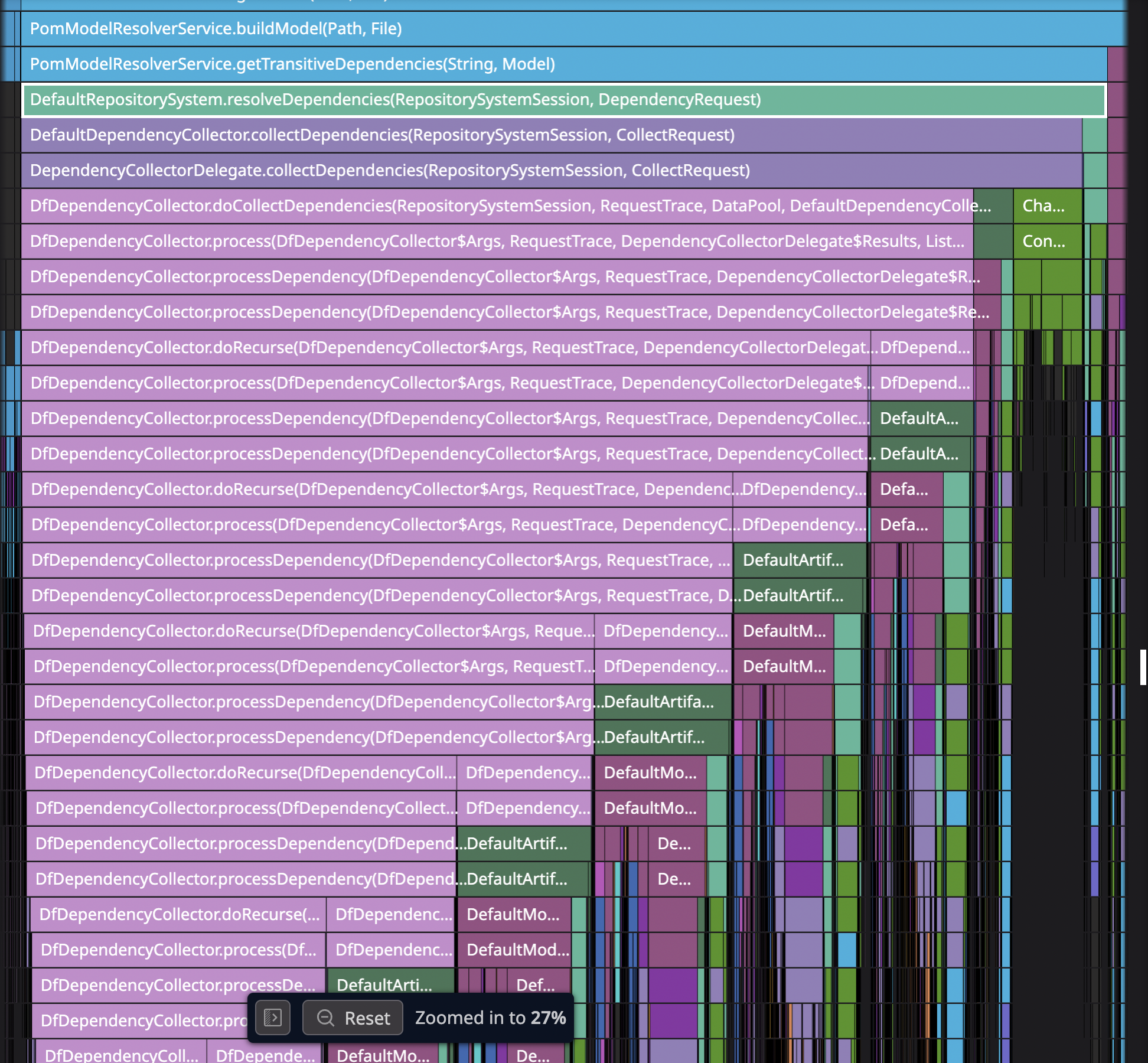we see 100% CPU load on our service. It appears that the resolver is stuck in process of resolving transitive dependencies