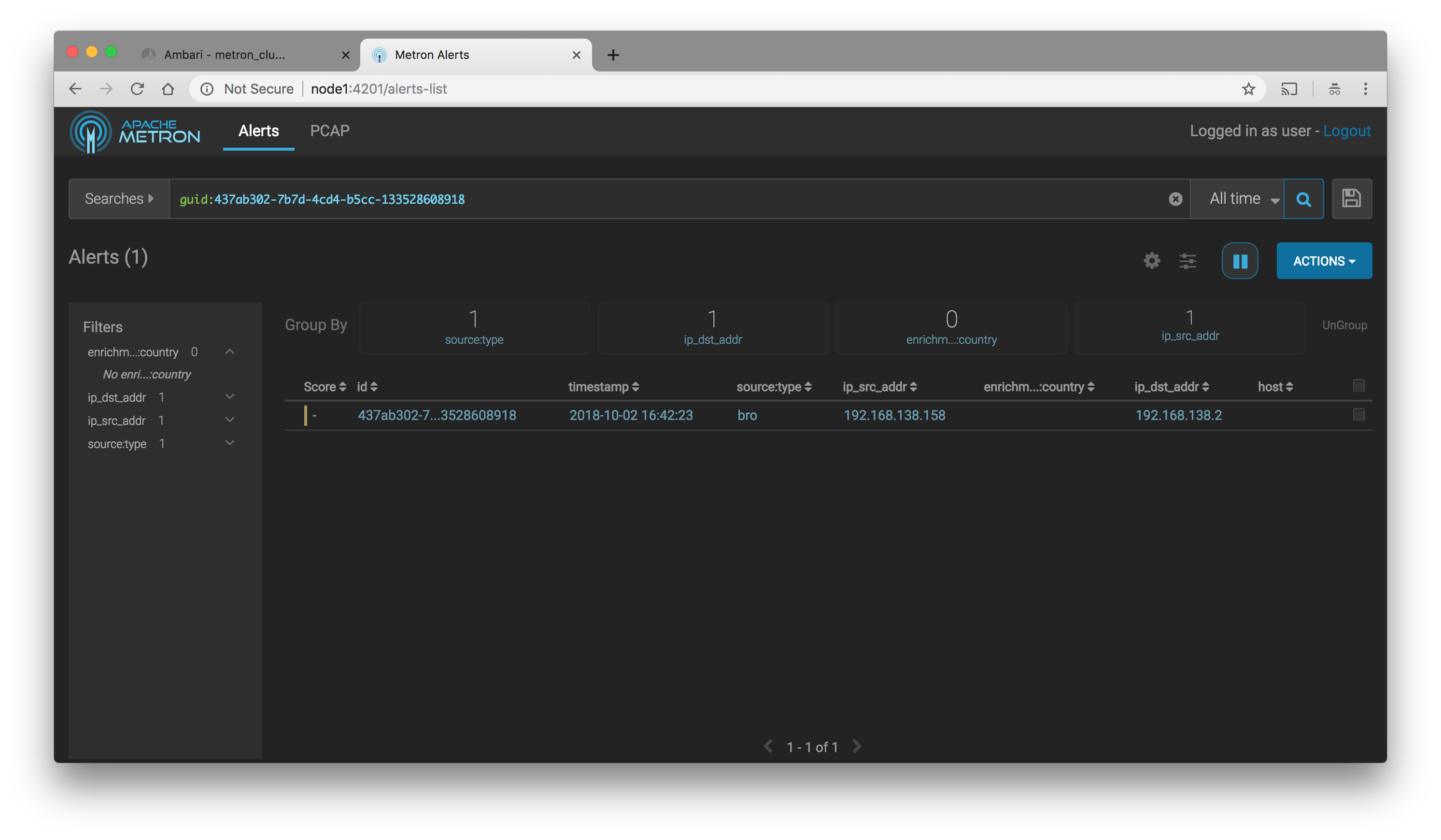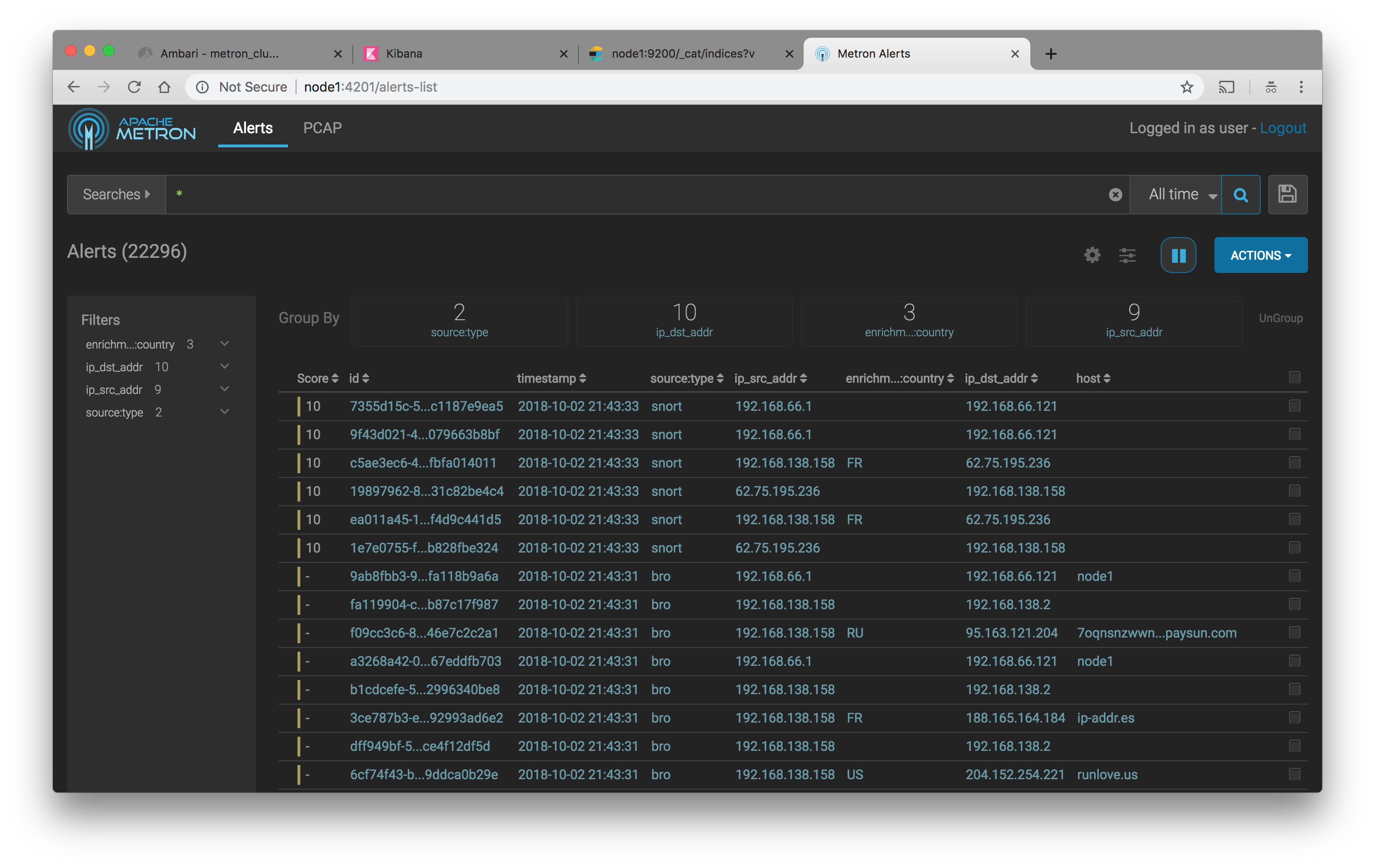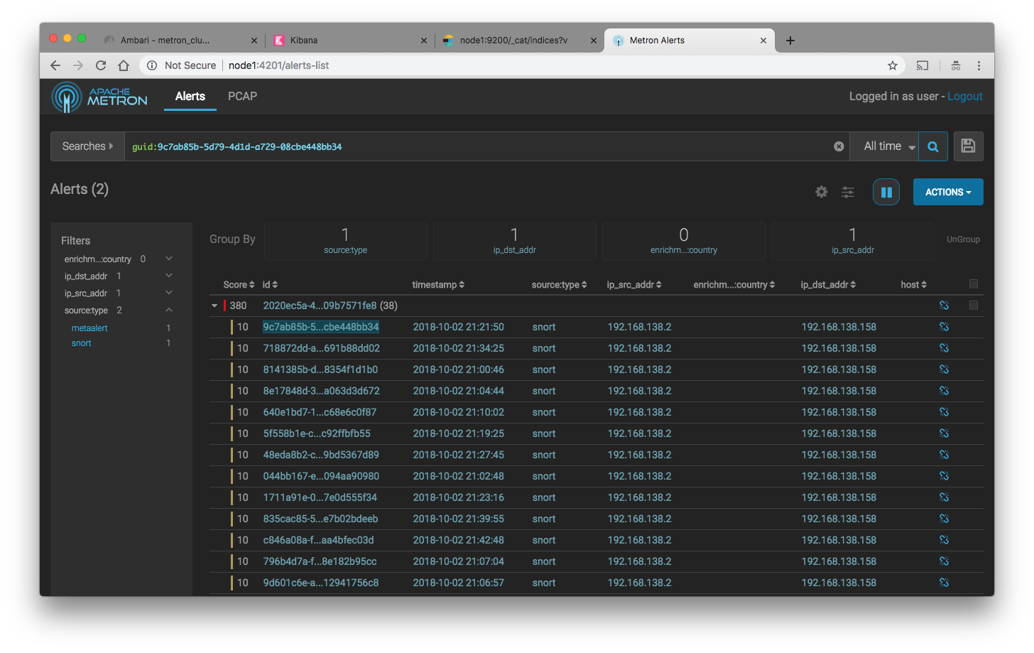 _idfield which has been generated by Elasticsearch. This will be different than the UUID generated by Metron and stored as part of the document asguid.Stop the indexing topologies using Ambari.