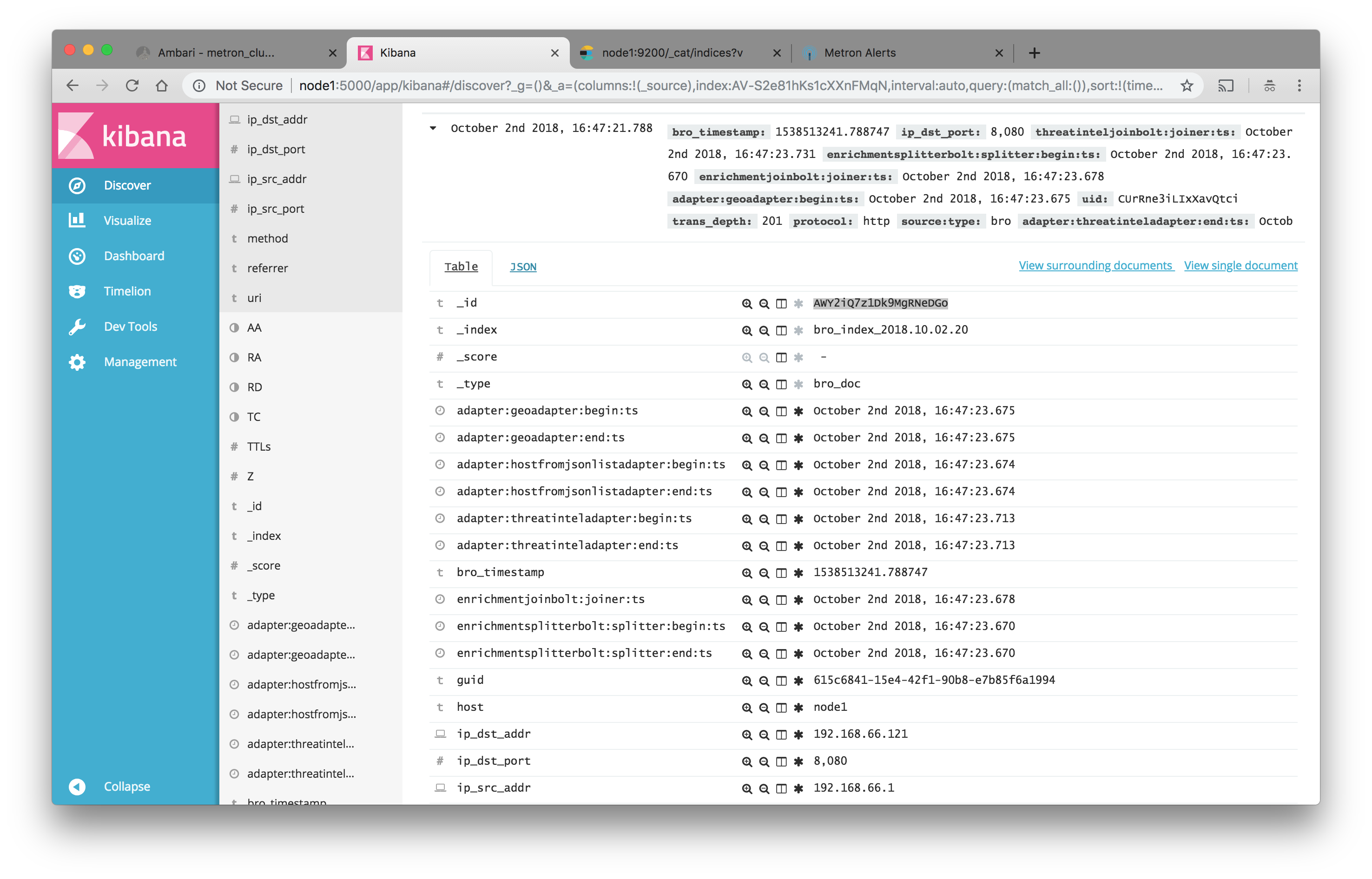 Open Kibana and verify that the document ID matches the Metron GUID.