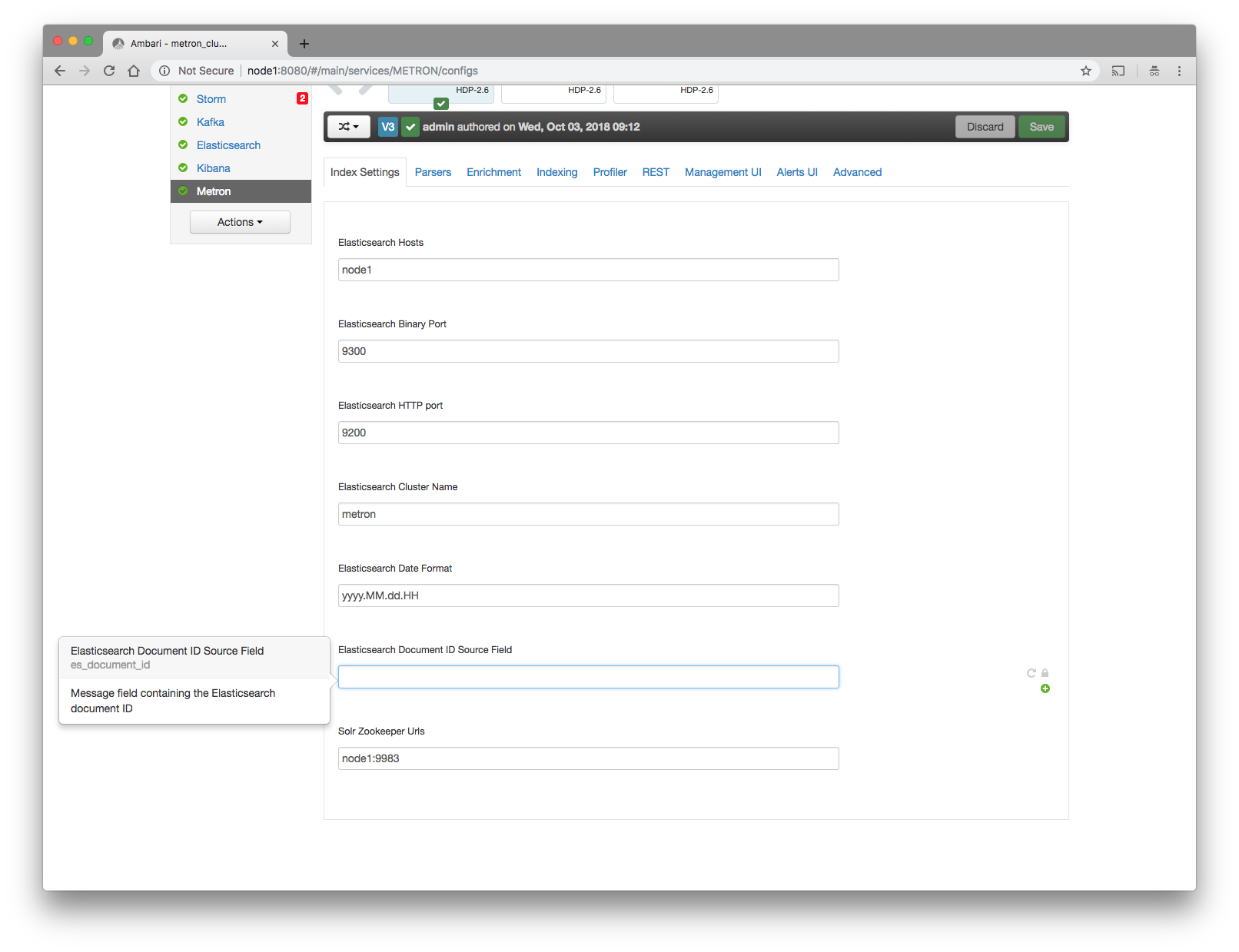Open Ambari and go to Metron > Configs > Index Settings. Notice that the default setting of