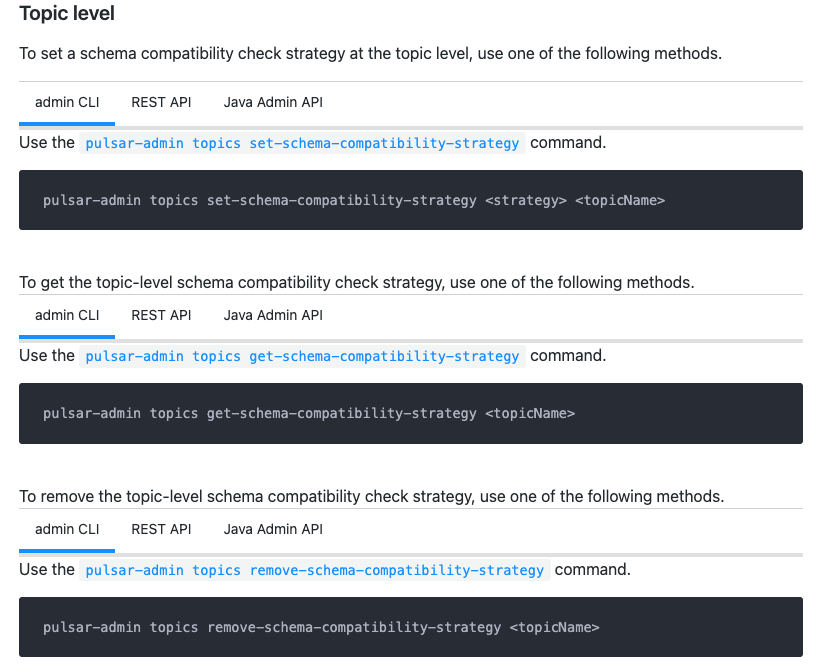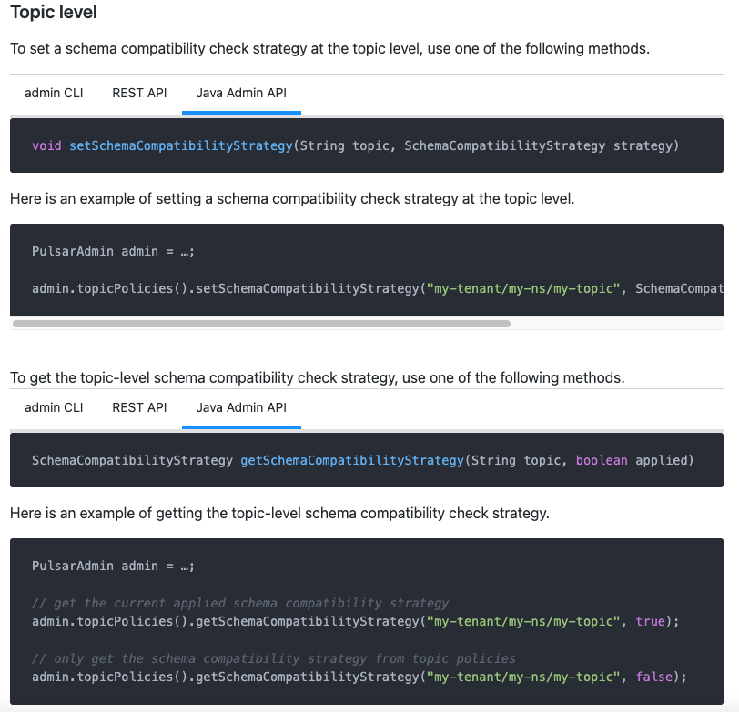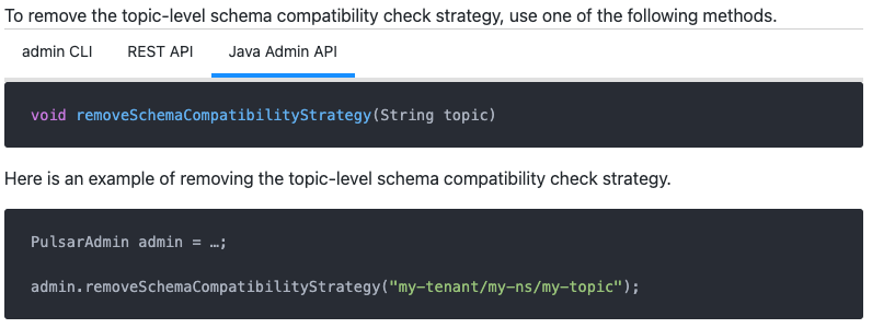 | - If you set schema compatibility check strategy at namespace level rather than broker level, it uses the strategy set for the namespace level. | ||