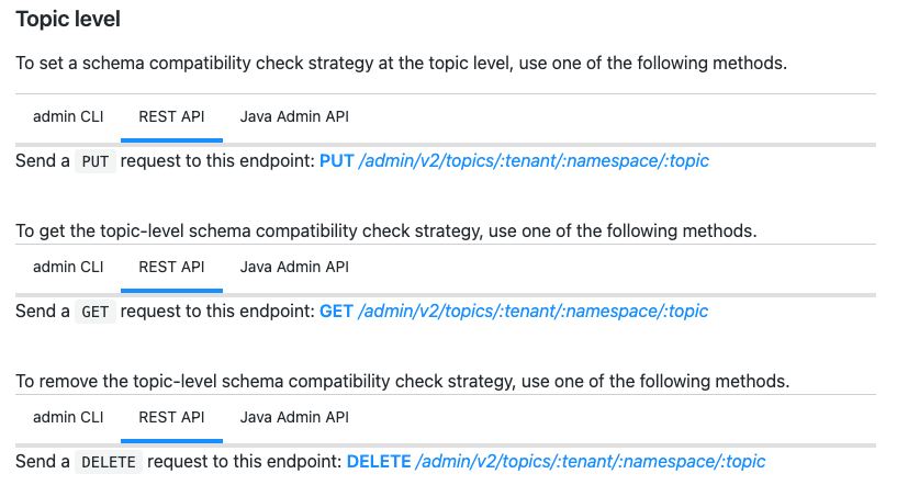 Add set/get/remove methods for topic-level schema compatibility check strategy in three ways.