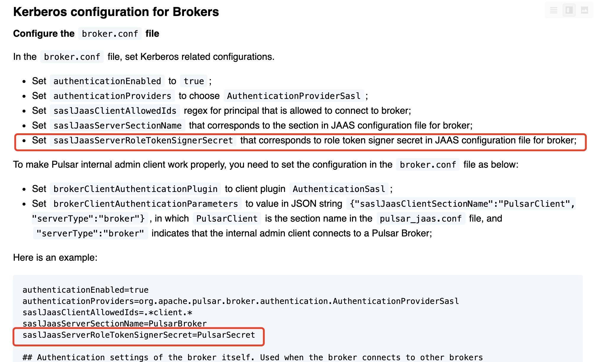 | |saslJaasServerSectionName|Service Principal, for login context name. By default, it is set to `SaslConstants.JAAS_DEFAULT_BROKER_SECTION_NAME`, which is "PulsarBroker".|N/A| | |