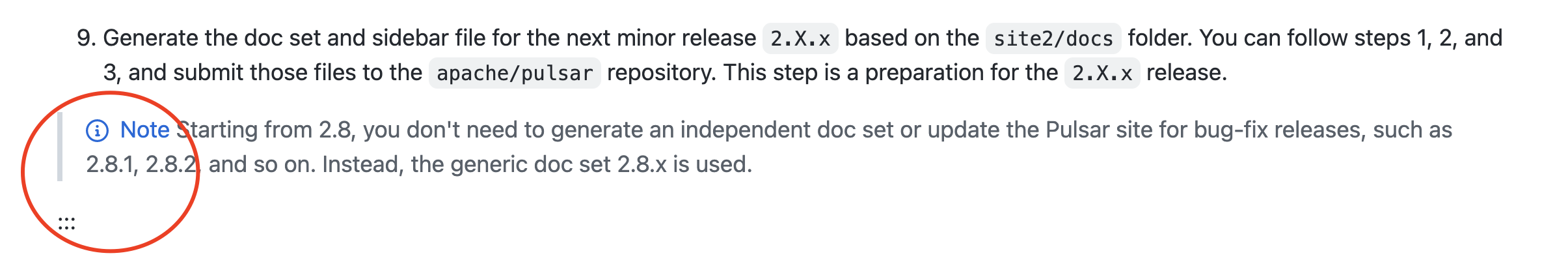 | > Starting from 2.8, you don't need to generate an independent doc set or update the Pulsar site for bug-fix releases, such as 2.8.1, 2.8.2, and so on. Instead, the generic doc set 2.8.x is used. | ||