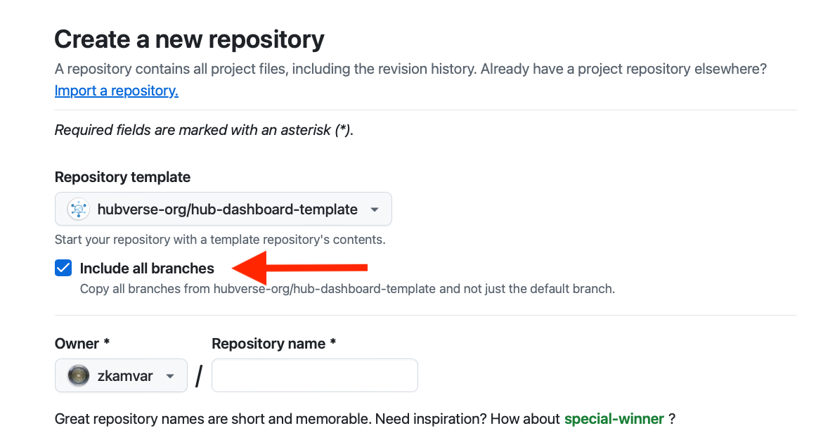 create a new dashboard repository from the The Dashboard Template and select include all branches