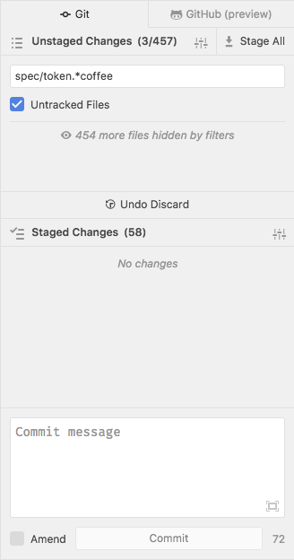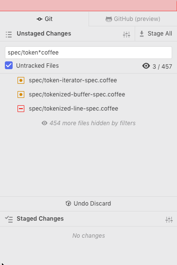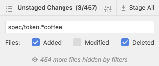 In some cases, the list of staged/unstaged/unmerged files can get to be pretty unmanageable. For these cases, it would be nice to have an easy mechanism for filtering the list down. I'm imagining a UI kinda like this: