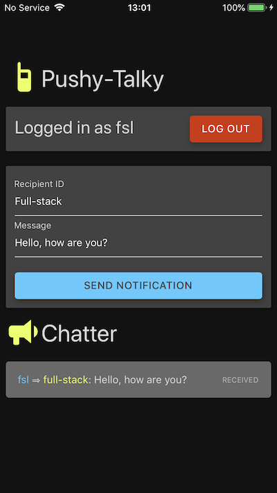 To try for real, install on at least one real device. Sign in with a user id, and then send a message to that user by entering the id in the Recipient ID field (push notifications can be sent from the iOS simulator, just not received, Android emulator should work).