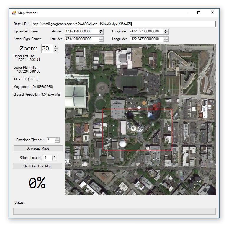 The default map source is Google Maps' satellite imagery, but MapStitcher should in theory be compatible with any map server which shares a similar API, 256x256 tiles, and the Mercator projection.
