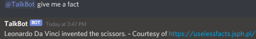 Random Fact: When users use the bot's random fact command (mentioning the bot with @ and putting "give me a fact" in the message), will use Python's requests library to request and display in chat a random fact via json from the Random Useless Facts API.