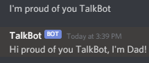 Hi I'm Dad: When users use I'm, I am, or similar words in server messages the bot will reply to the user with "Hi, [word after I'm], I'm Dad!". Uses regular expression matching to find the correct syntax regardless of capitalization or use/absence of apostrophe.