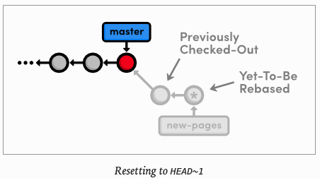 M index.htmlThe git reset command moves the checked out snapshot to a new commit, and the HEAD~1 parameter tells it to reset to the commit that occurs immediately before the current HEAD (likewise, HEAD~2 would refer to second commit before HEAD). In this particular case, HEAD~1 happens to coincide with master. The effect on our repository can be visualized as: