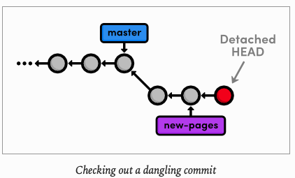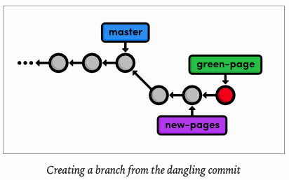 Add green pageThis will display all commits contained in green-page that are not in the new-pages branch. The above command tells us the green-page contains one more snapshot than new-pages: our dangling commit (although, it is not really dangling any more since we created a branch for it).