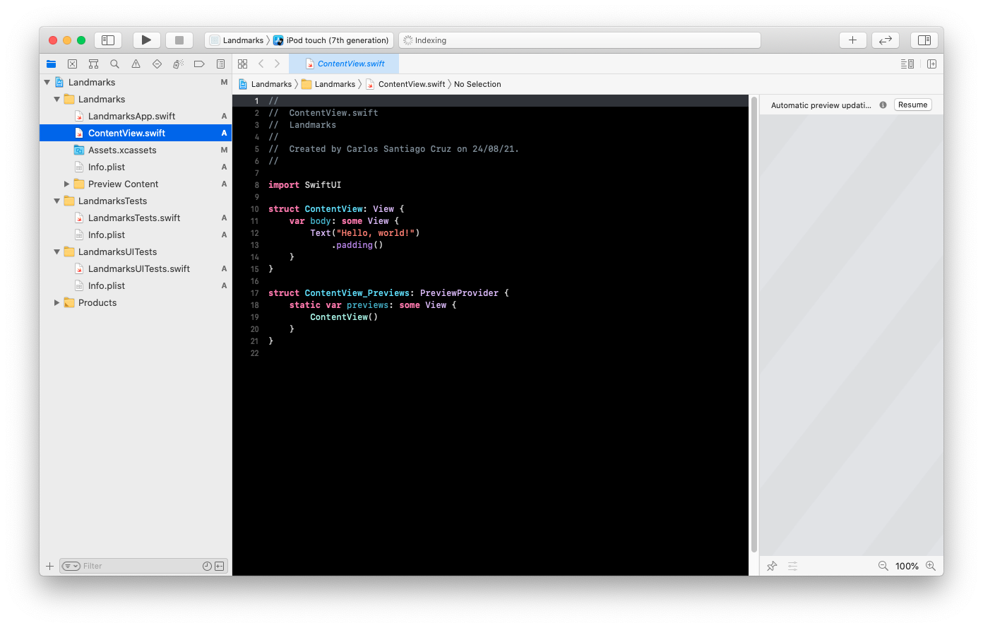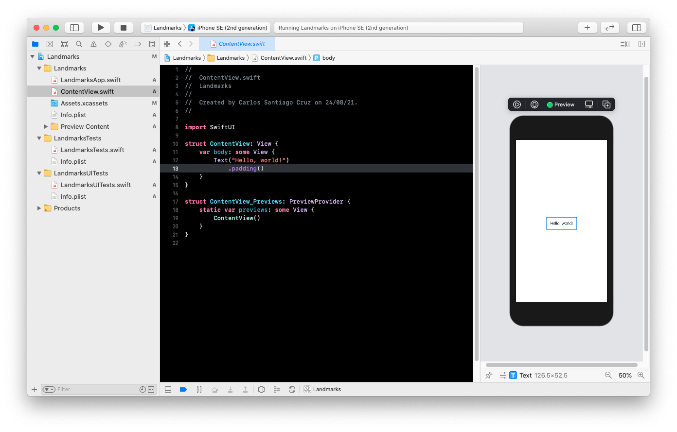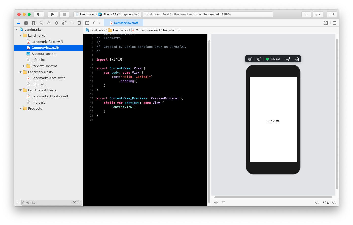 Create a new Xcode project that uses SwiftUI. Explore the canvas, previews, and the SwiftUI template code.