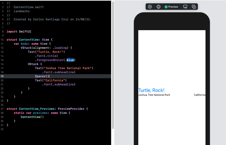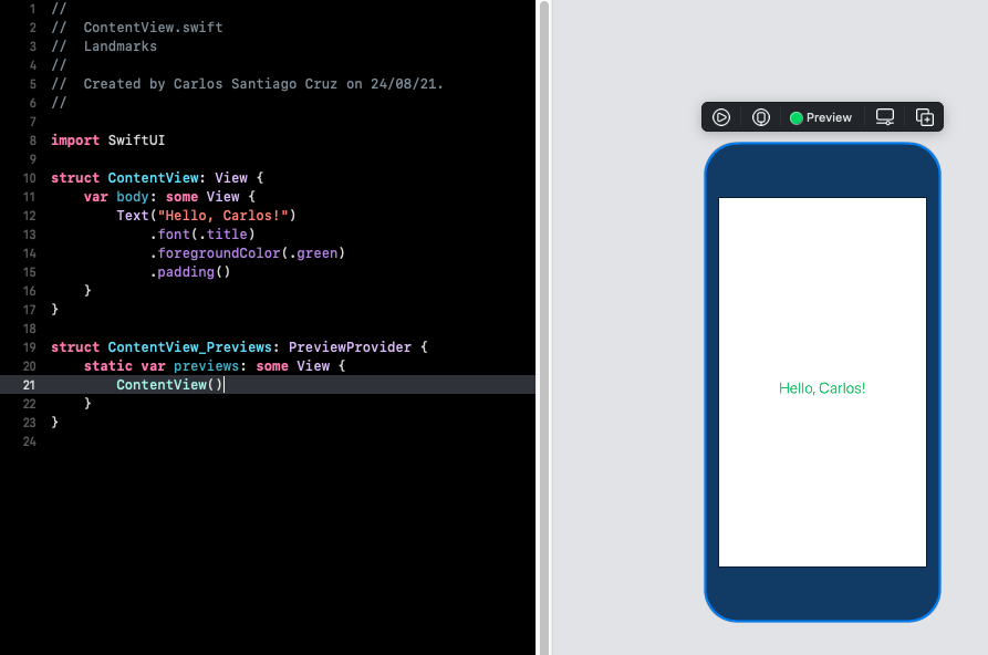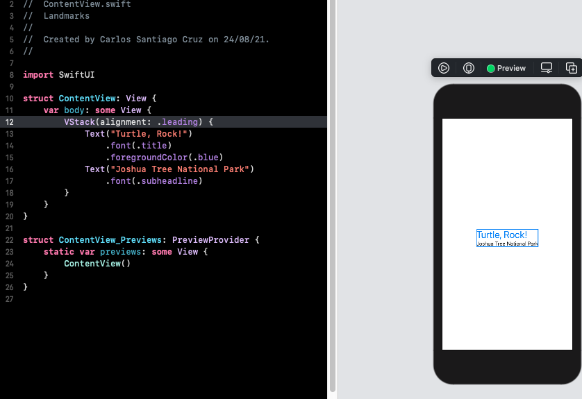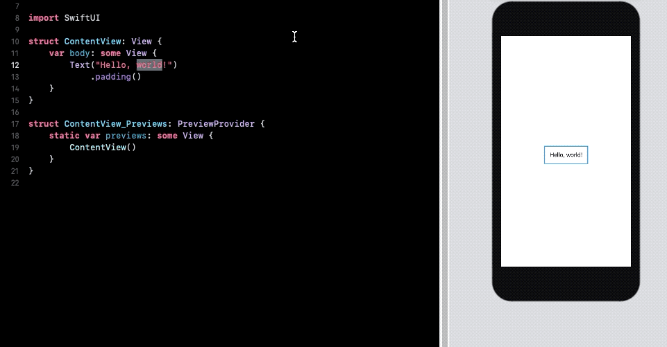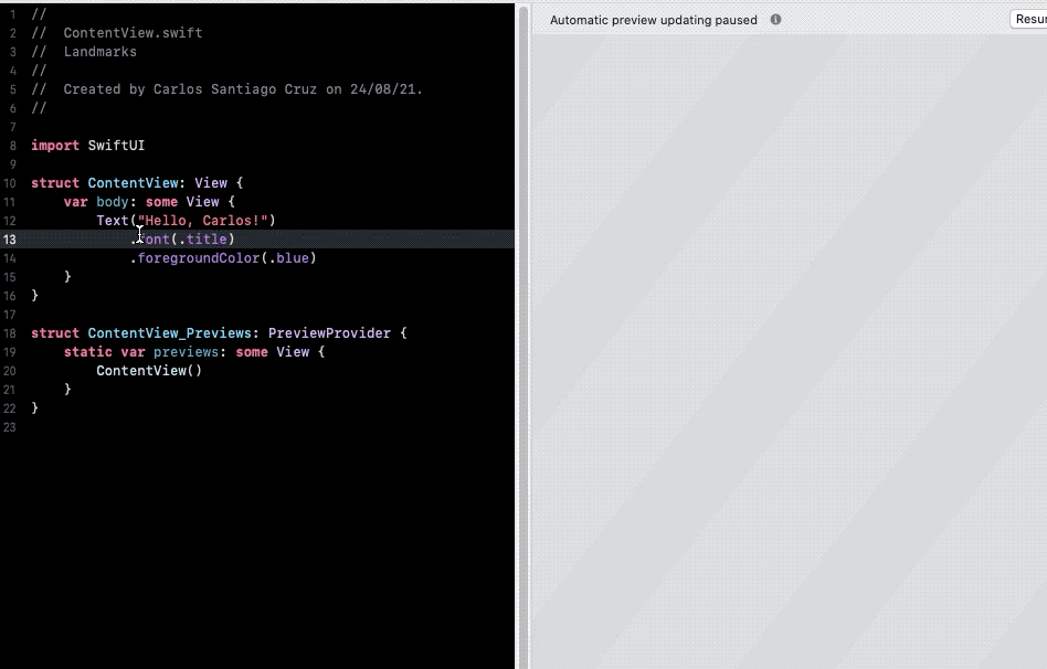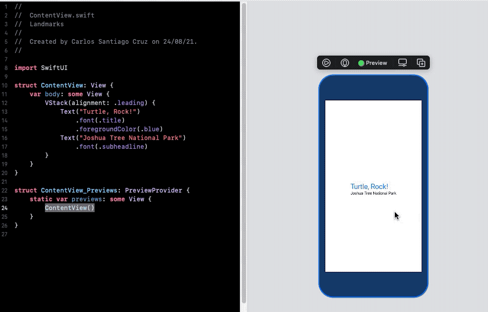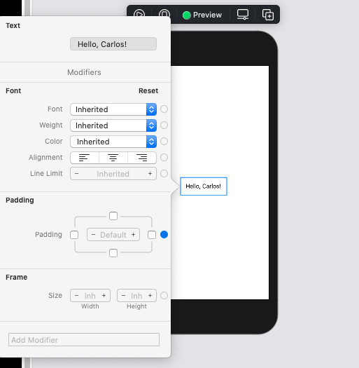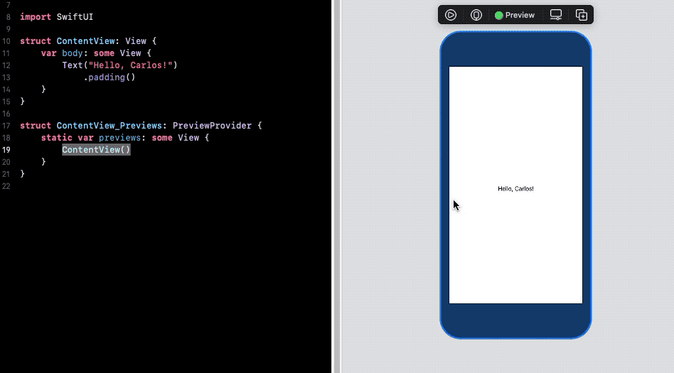 As you change the code in a view's body property, the preview updates to reflect your changes.