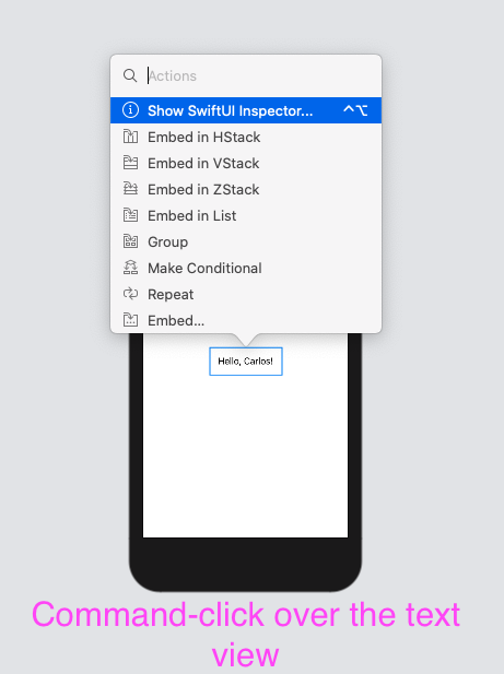 - In the preview, Command-click the greeting to bring up the structured editing popover, and choose "Show SwiftUI inspector".